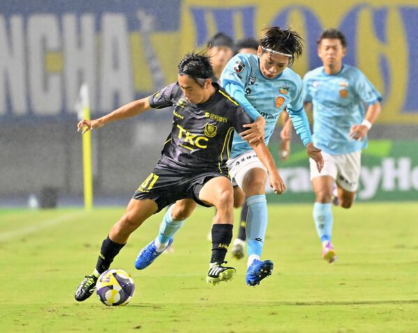 前半2分、栃木SCのFW中野(左)が相手と競り合いながらゴールに攻め込む=カンセキスタジアムとちぎ、広瀬華撮影