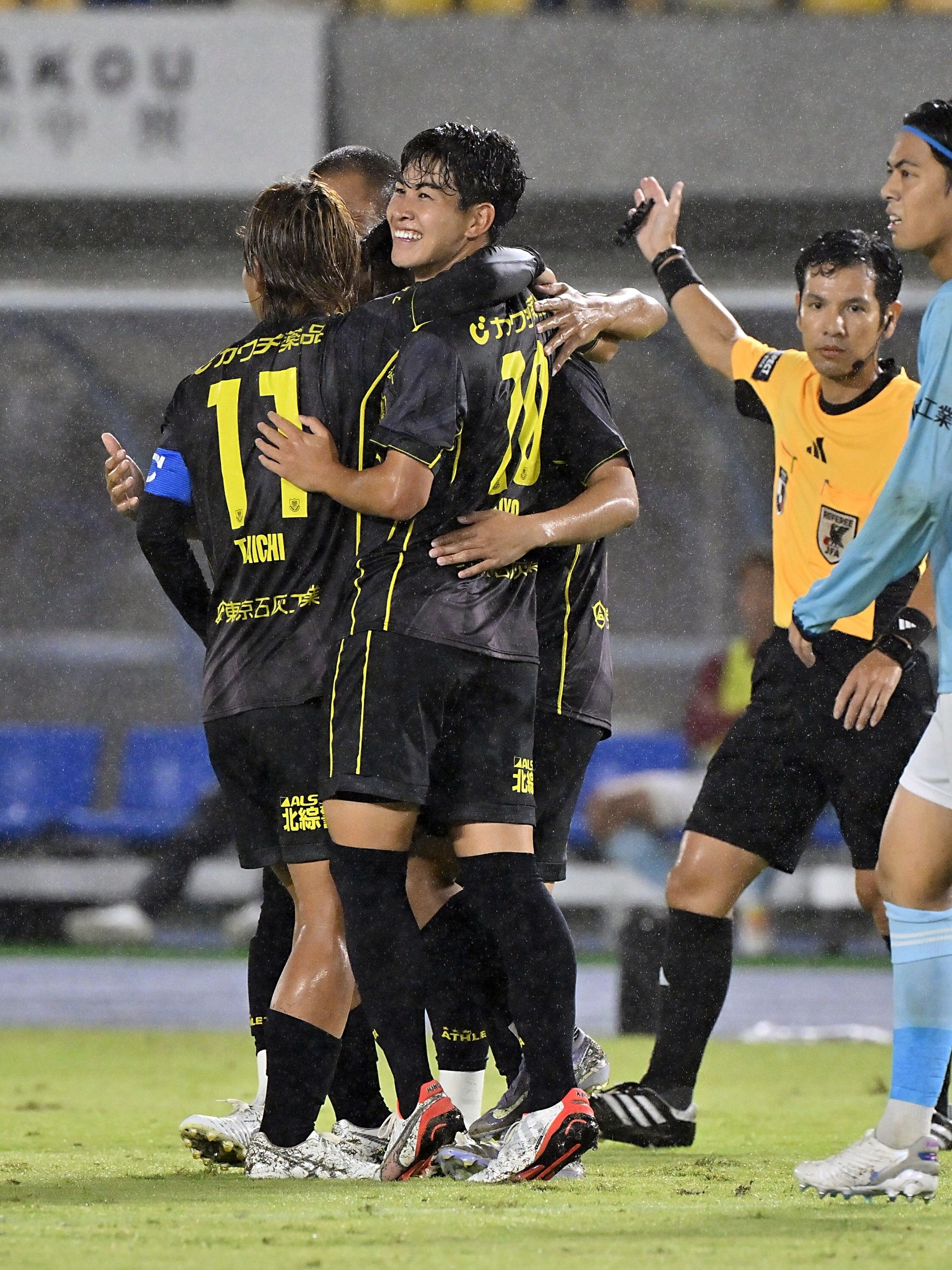 前半23分、3点目のシュートを決めた栃木SCのFW五十嵐(手前右)が仲間と笑顔で抱き合う=カンセキスタジアムとちぎ、広瀬華撮影
