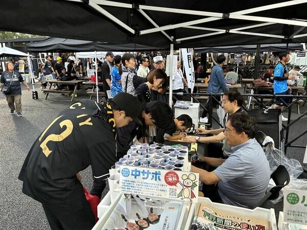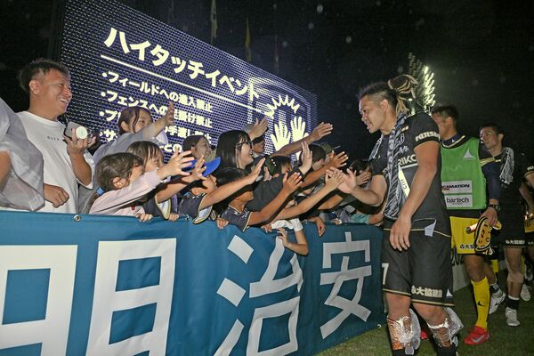 3-0で快勝し、ハイタッチする栃木シティの選手とファン=午後8時、栃木市岩舟町三谷、森田大地撮影