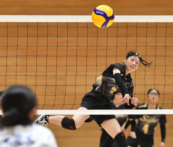 女子1回戦 第2セット、足利清風の山田が強烈なスパイクを決める=明保野体育館
