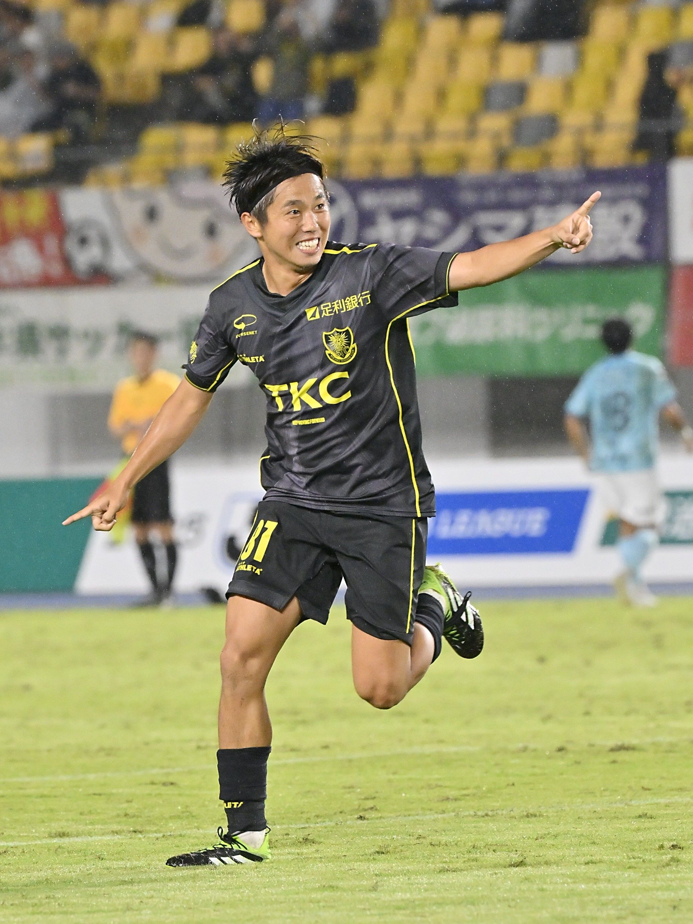 後半20分、シュートを決めた栃木SCのFW中野が笑顔で駆け出す=カンセキスタジアムとちぎ、広瀬華撮影