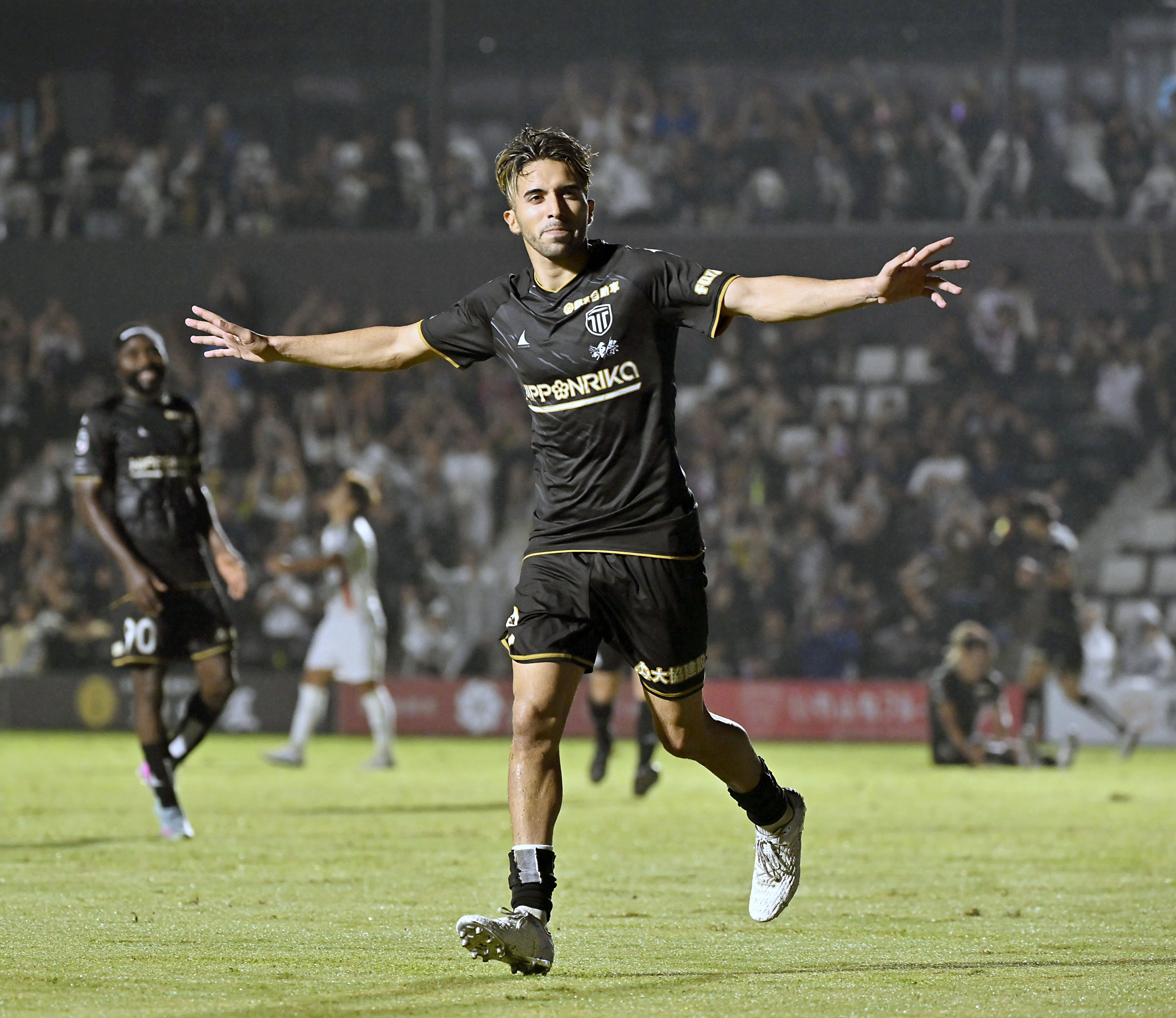 後半追加タイム、この日自身2点目を決め、両手を広げる栃木シティのFWバスケス=CFS、森田大地撮影