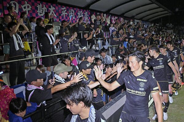 3-0で快勝し、ハイタッチする栃木シティの選手とファン=午後8時5分、栃木市のシティフットボールステーション、森田大地撮影
