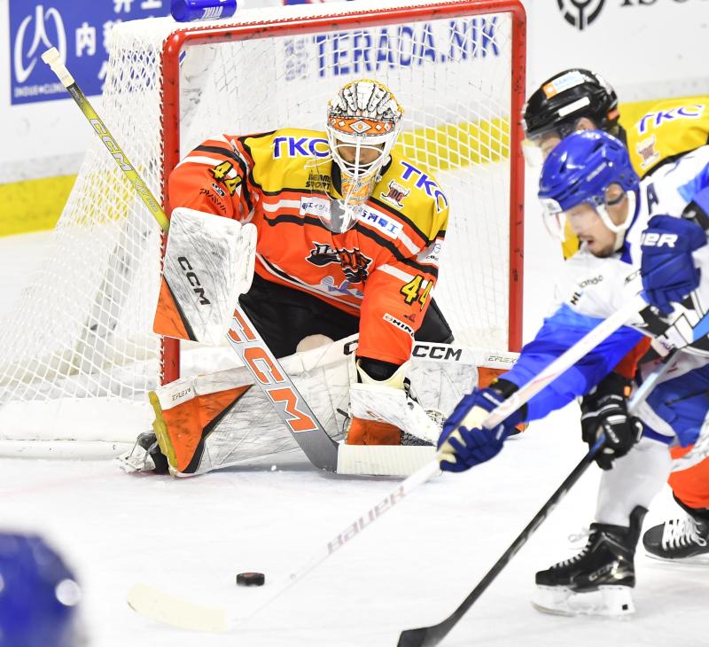 第2ピリオド9分、シュートを好セーブするバックスのGK福藤=日光霧降アイスアリーナ、湯田大士撮影