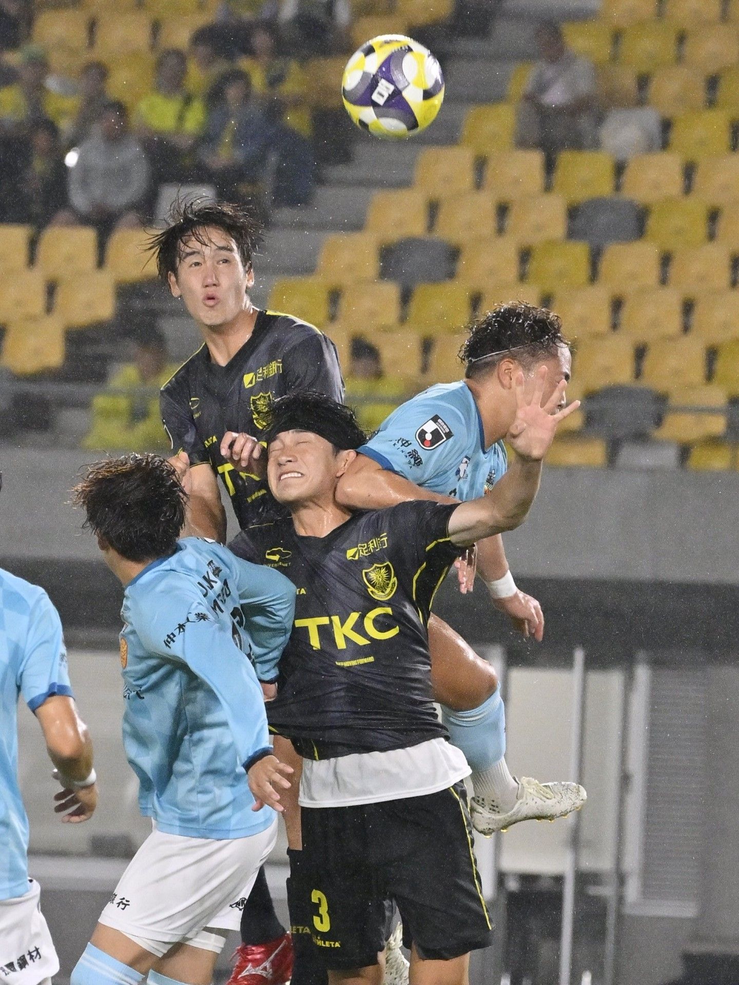 前半25分、栃木SCのFW太田(左)がゴール前で相手と競り合う=カンセキスタジアムとちぎ、広瀬華撮影