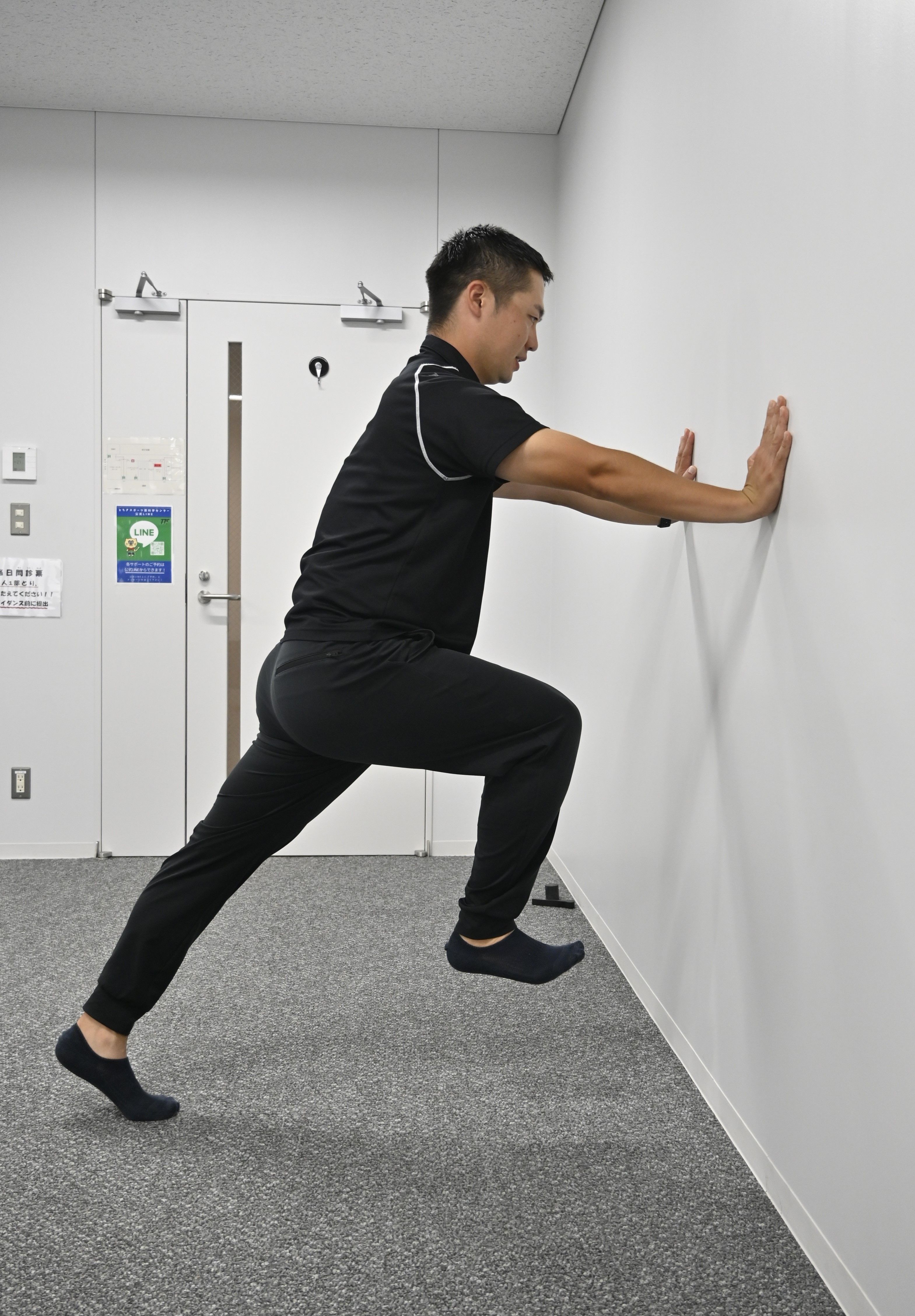 「壁ドリル」のスタートポジション。この姿勢を崩さないまま両足を素早く交互に入れ替える