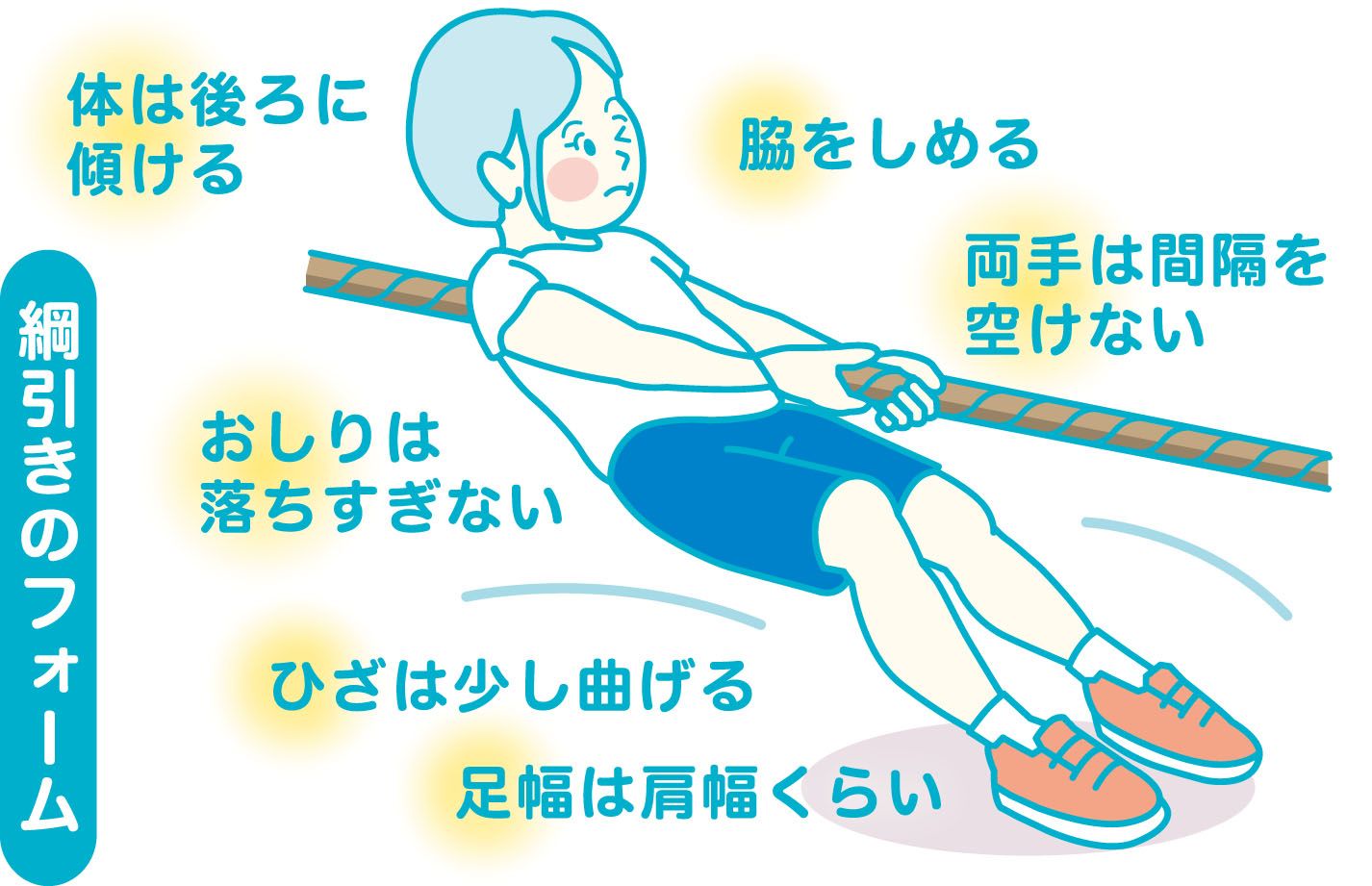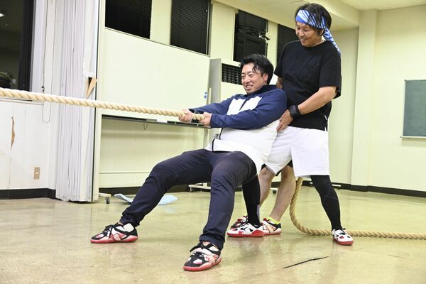 記者(左)も練習を体験。全身のパワーを爆発させる競技の一端に触れ、わずかな時間で汗だくに。正しいフォームで綱を引くと腕ではなく足に疲れが出るという