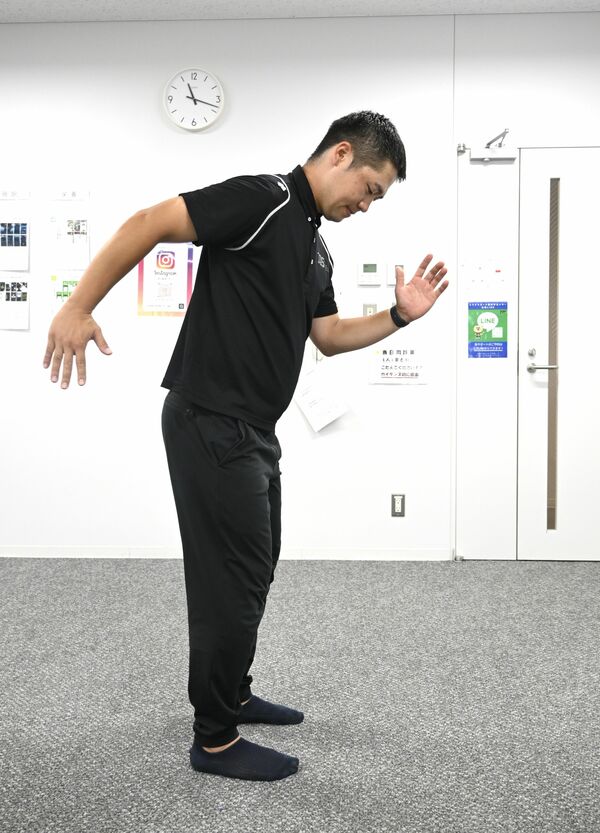腕振り練習のスタートポジション。手をズボンの横ポケットに入れるイメージを持ちながら素早く通過させる