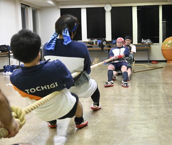 綱遊会の練習風景。選手が後ろに体を倒して綱を引いていることが分かる。これは専用シューズが滑り止めになっているためで、屋外で体を後ろに倒し過ぎると足が滑るので注意が必要だ
