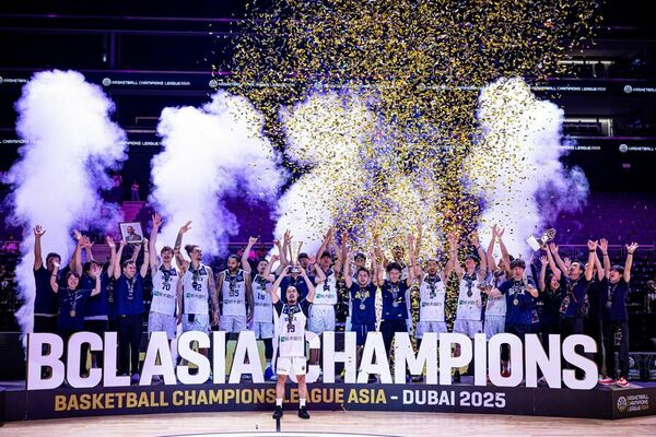 BCLアジアで優勝し、表彰式で喜びを爆発させるブレックスの選手たち=UAEのドバイ(BCLアジア提供)