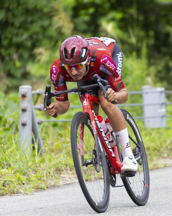 追走するブリッツェンのアコスタ=新潟県南魚沼市の三国川ダム周回特設コース