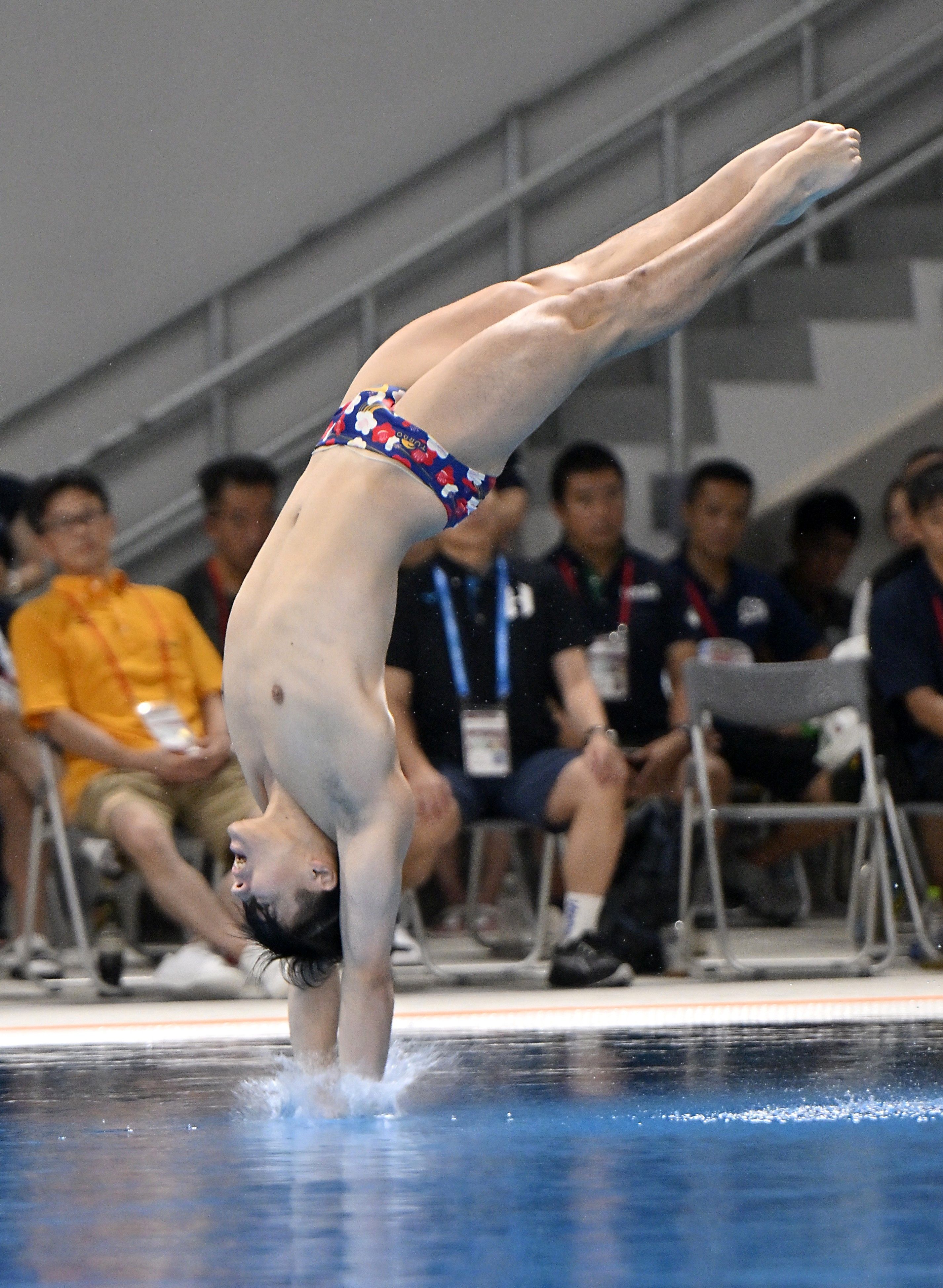 成年男子板飛び込み決勝 2位に入った須山(日本水泳振興会)の3回目の演技=滋賀県のインフロニア草津アクアティクスセンター、磯真奈美撮影