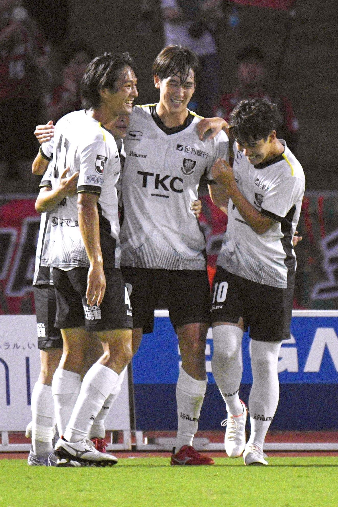 前半13分、先制ゴールを決めて仲間と喜ぶ栃木SCのFW太田(中央)=高知県春野総合運動公園陸上競技場