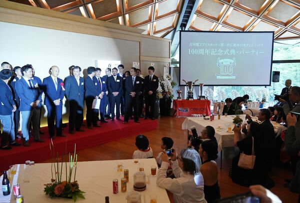 壇上に立つバックスの元選手たち=15日午後、日光市山内