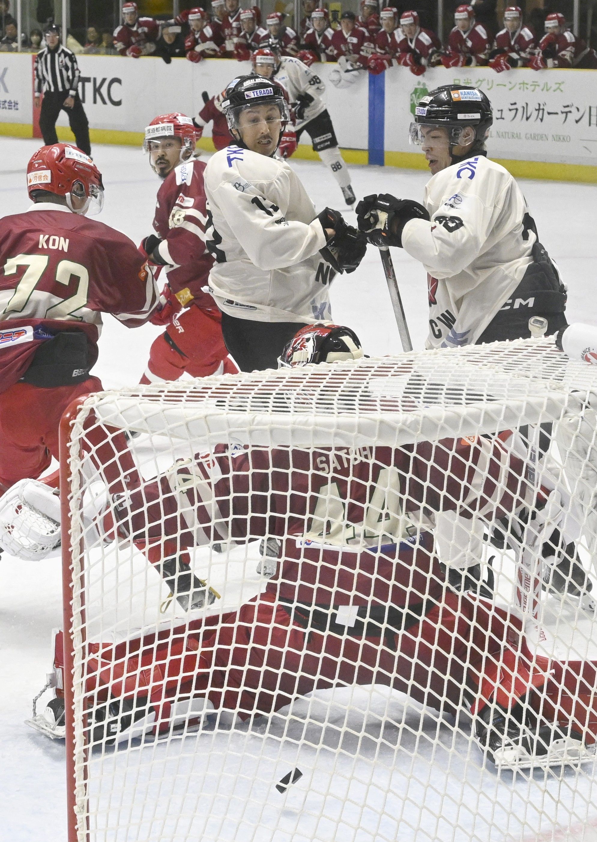 第3ピリオド18分46秒、アイスバックスのFW出口(中央)が1点差に迫るゴールを決める=日光霧降アイスアリーナ、森田大地撮影