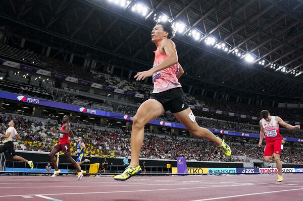 男子400メートル予選 ゴールする佐藤風雅(手前)=国立競技場