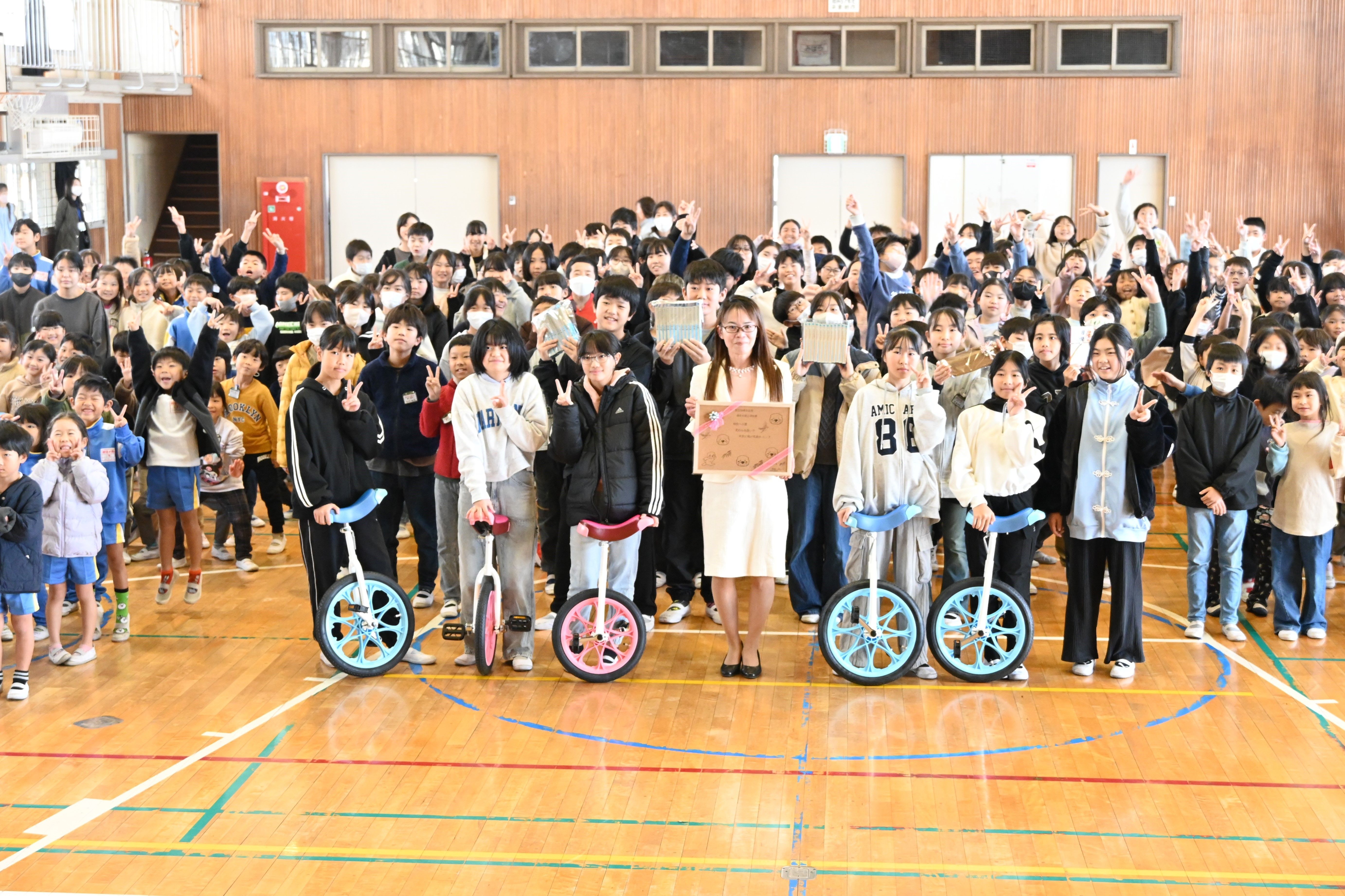同校で行われた贈呈式で、メッセージボードを手にする小澤さん(中央)