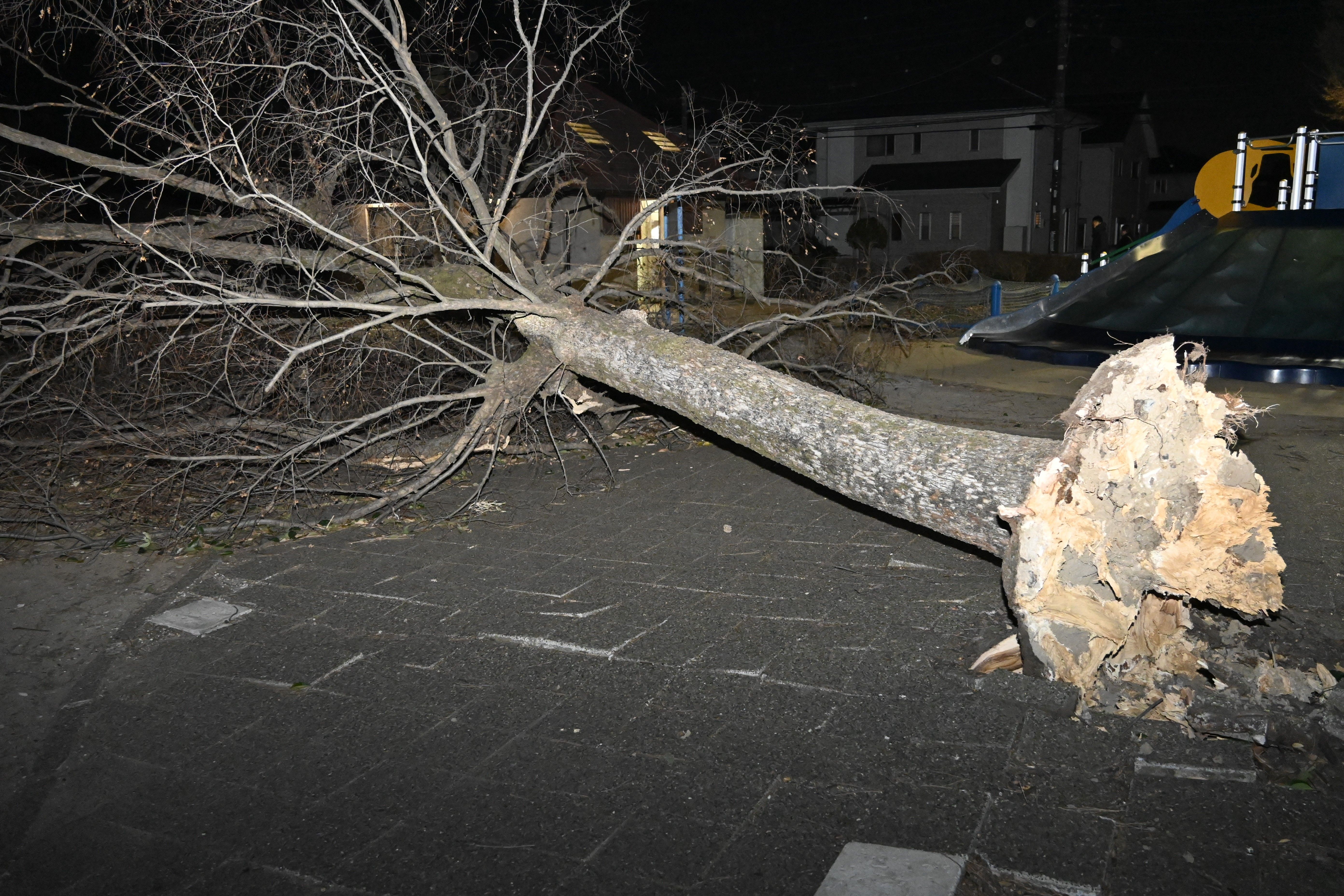 強風で倒れたとみられる西部中央公園の樹木=11日午後6時、佐野市大橋町