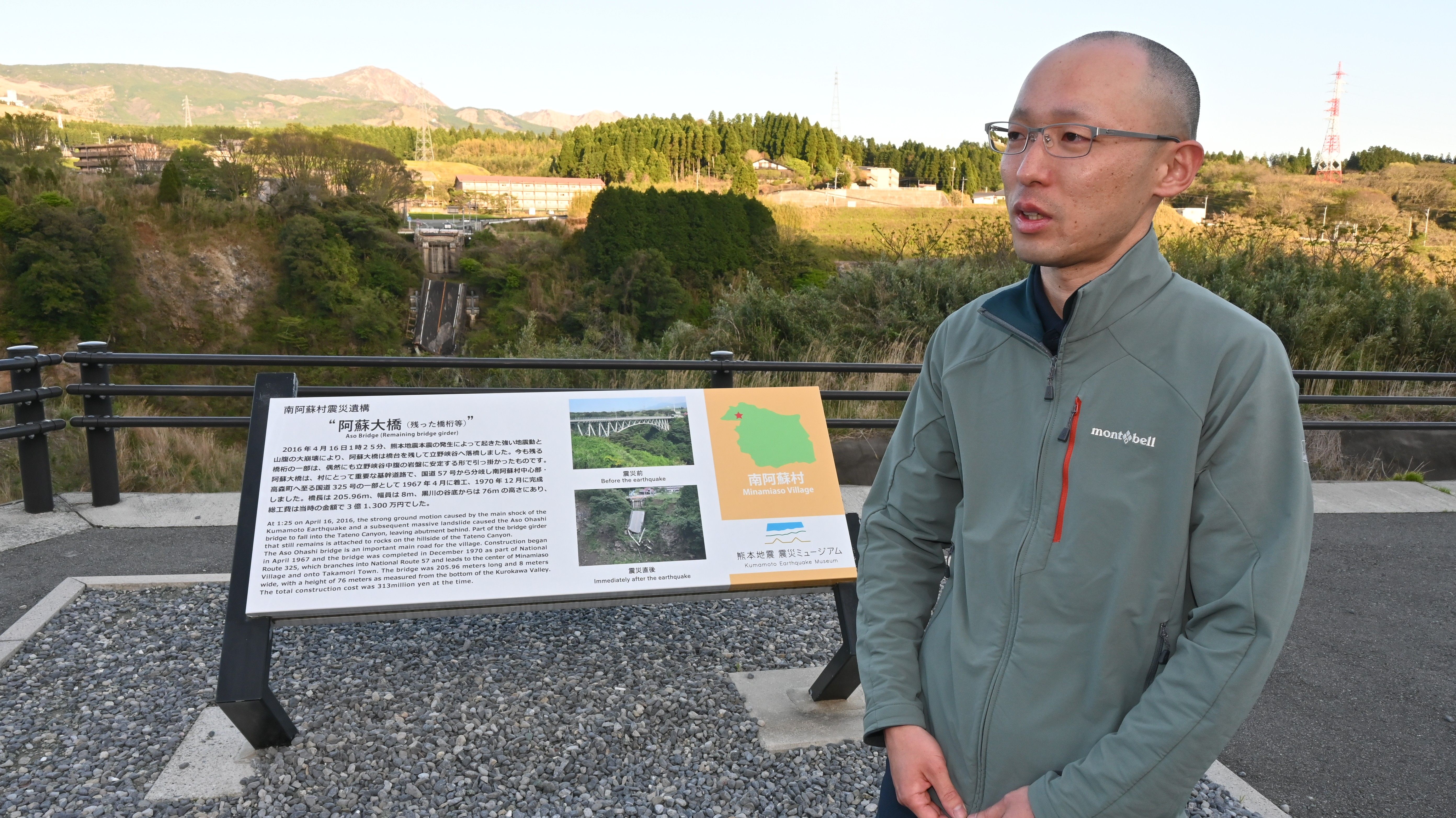 地震で崩落した後、再建された新阿蘇大橋や崩落した山肌を背に村への思いを語る粂川さん=16日夕方、熊本県南阿蘇村