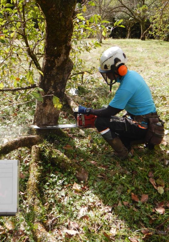 氷室地区の女性宅で柿の木を伐採する業者