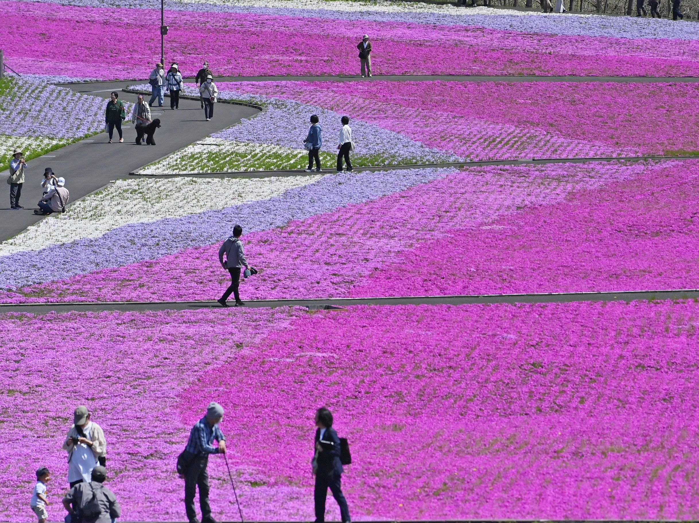 一面を鮮やかに彩るシバザクラ=16日午前11時5分、市貝町見上