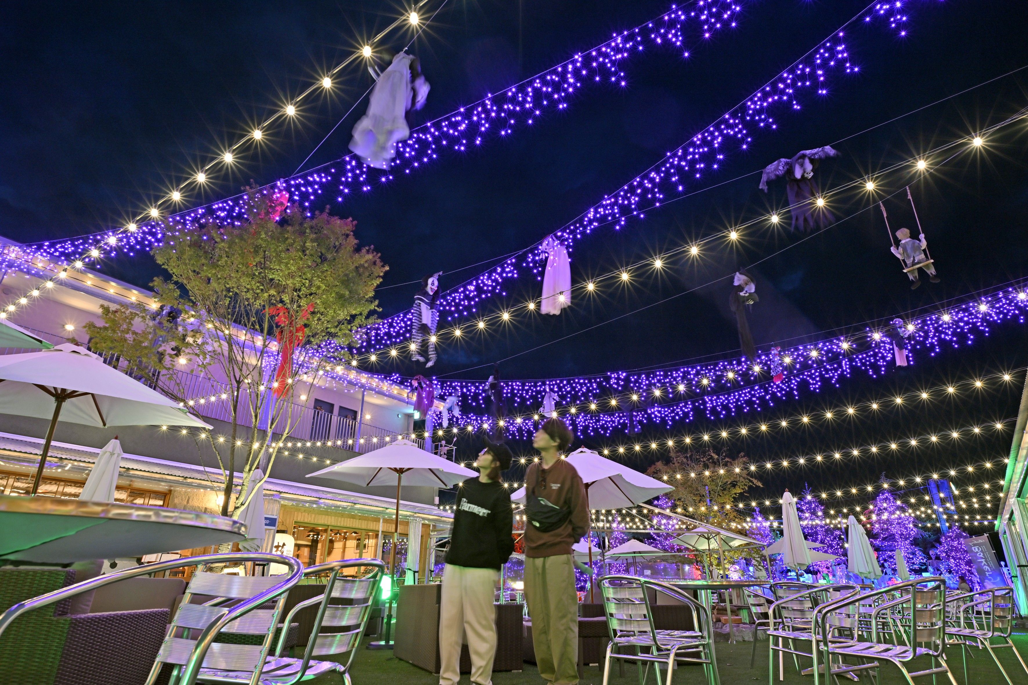 ハロウィーンのゾンビ人形が並ぶ施設=15日午後6時30分、那須塩原市鹿野崎