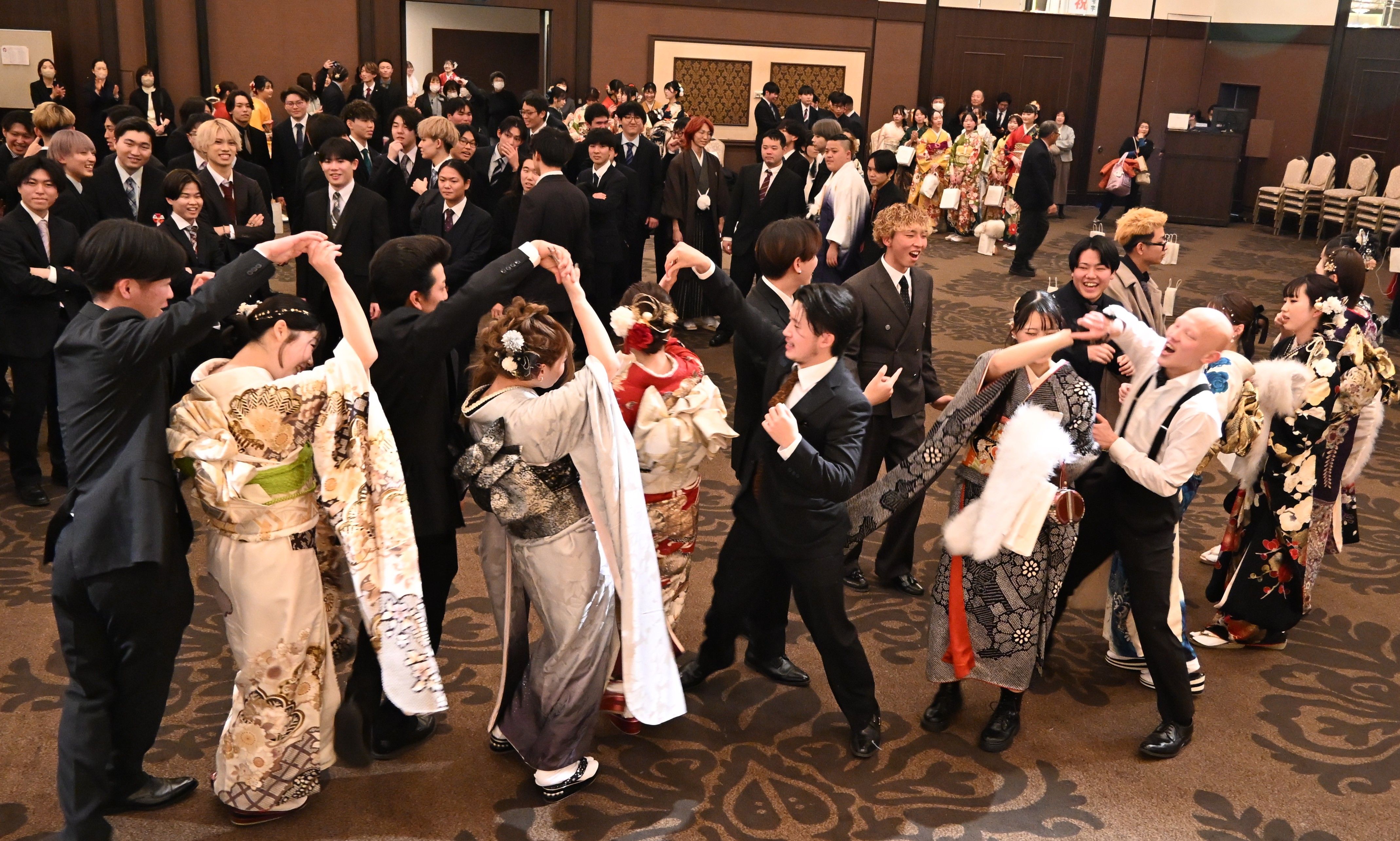 式典後、フォークダンスを楽しむ出席者たち=11日午後、宇都宮市上大曽町