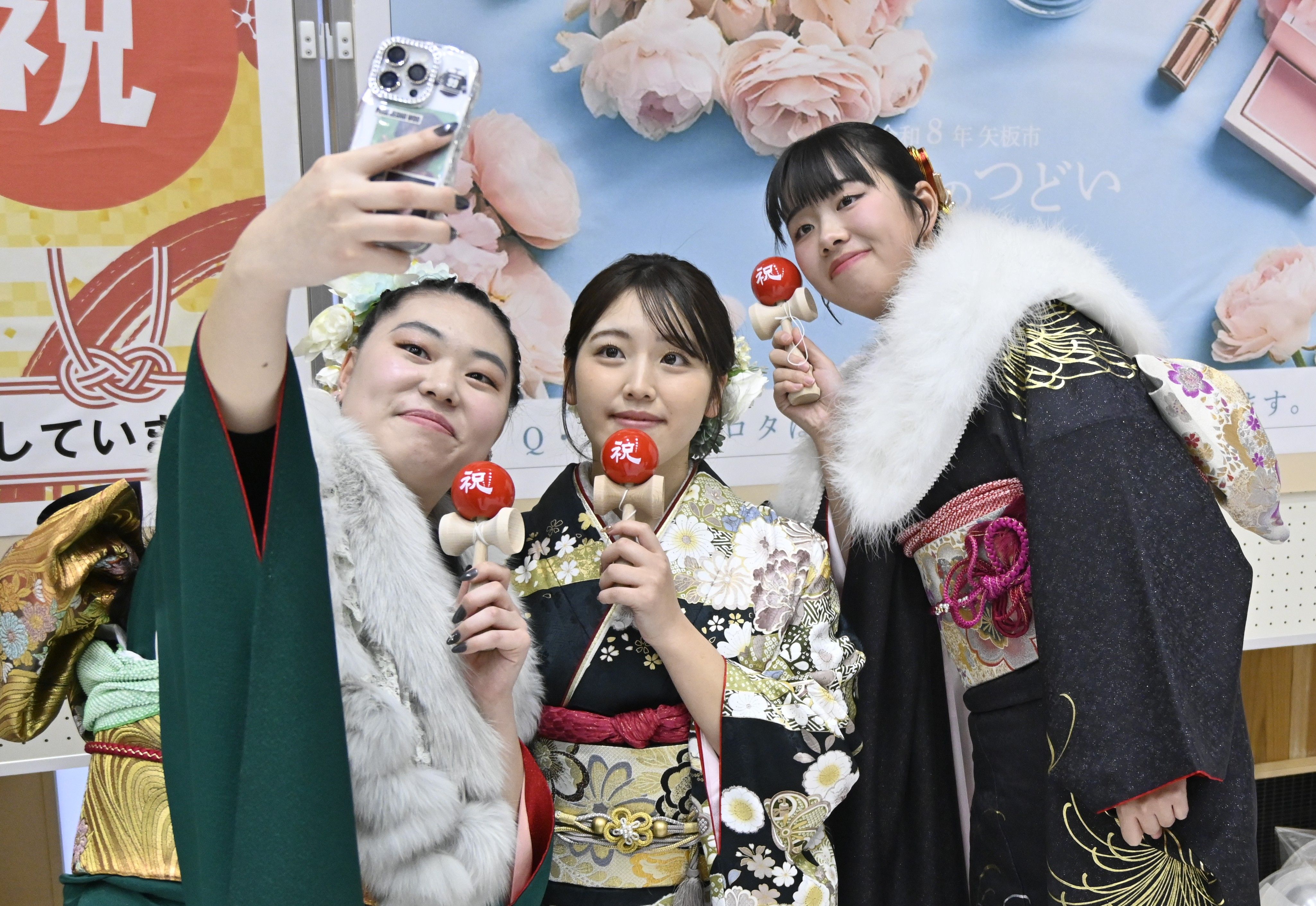 けん玉を手に記念撮影する参加者=矢板市