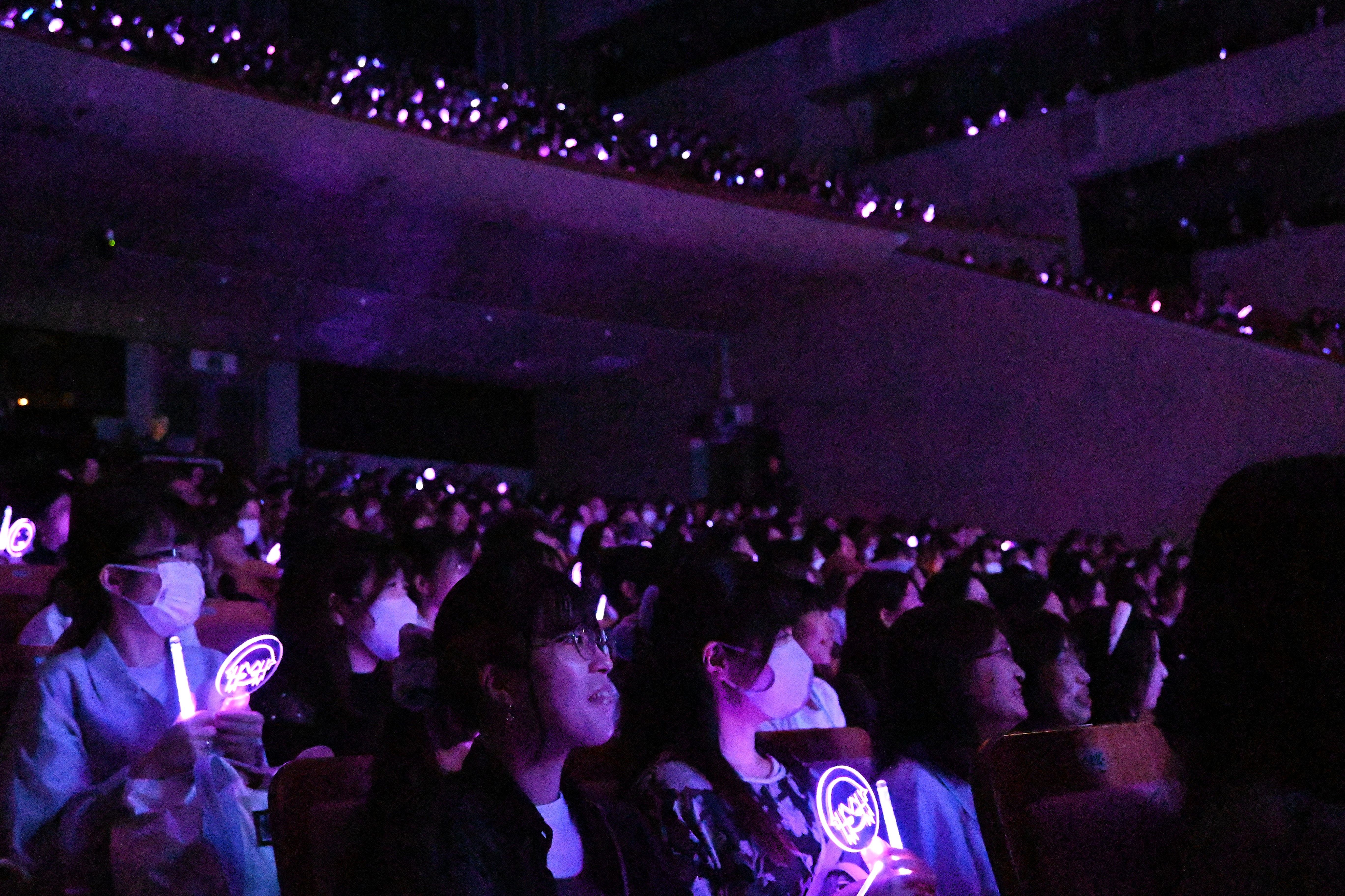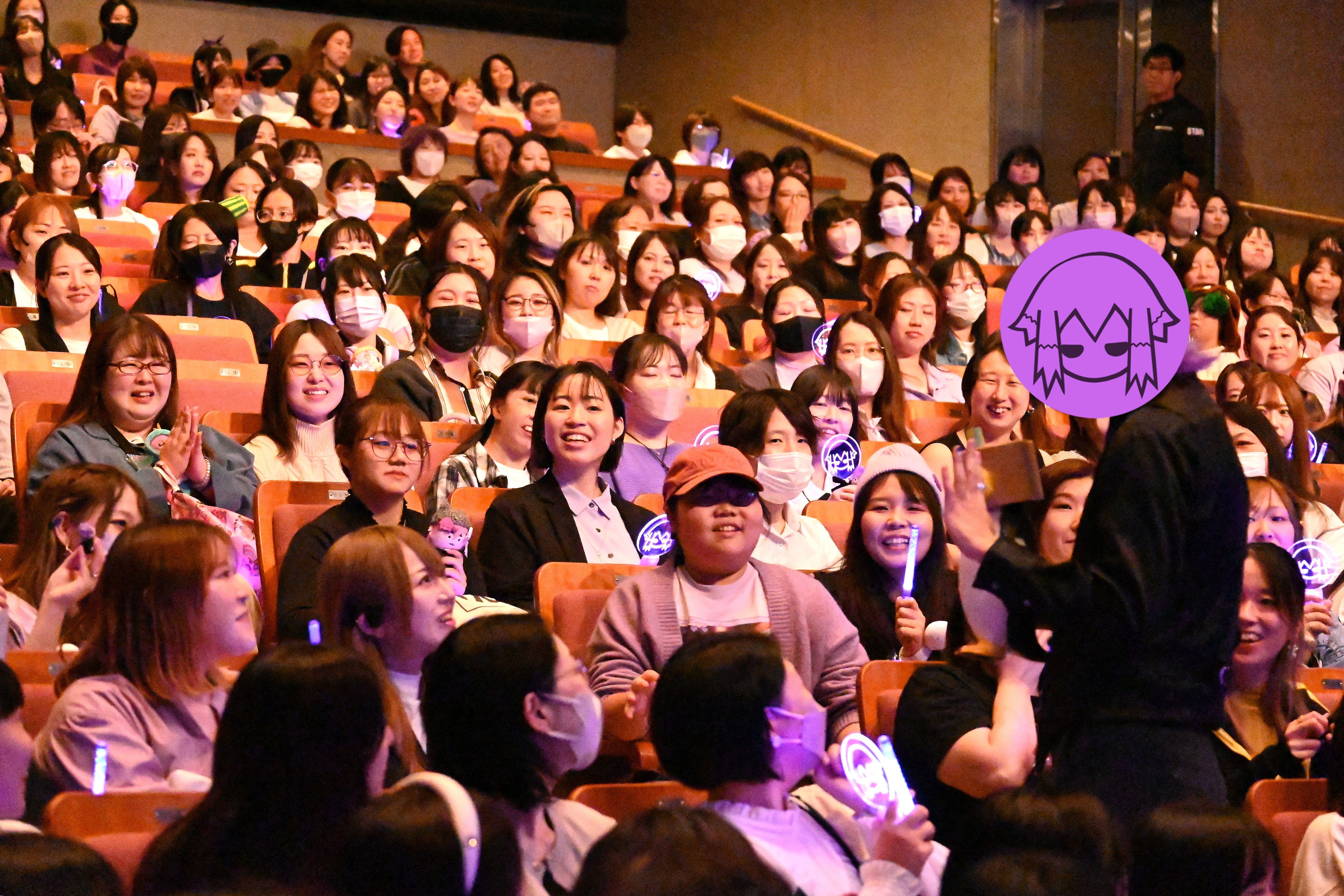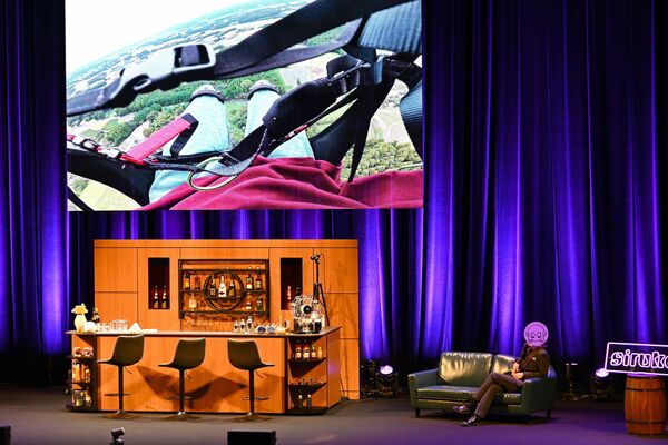 スクリーンに映し出されたパラグライダーロケを紹介するしるこさん