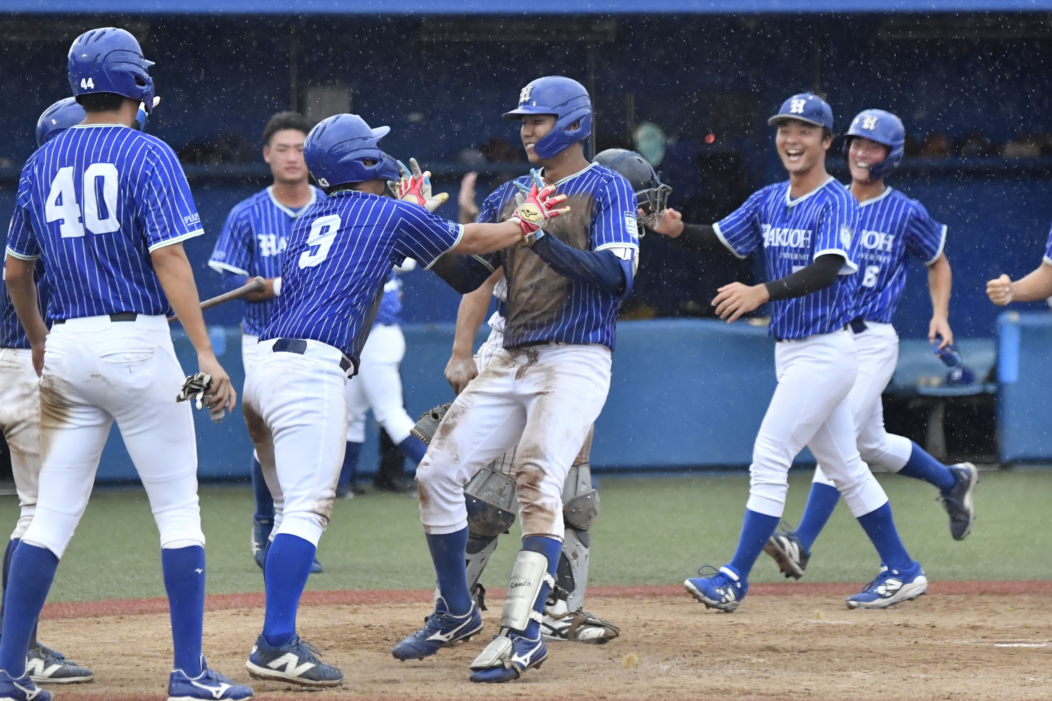 9回、サヨナラ3点本塁打を放ち、仲間に迎えられる白鴎大の秋山(中央)=白鴎大野球場、鈴木航撮影