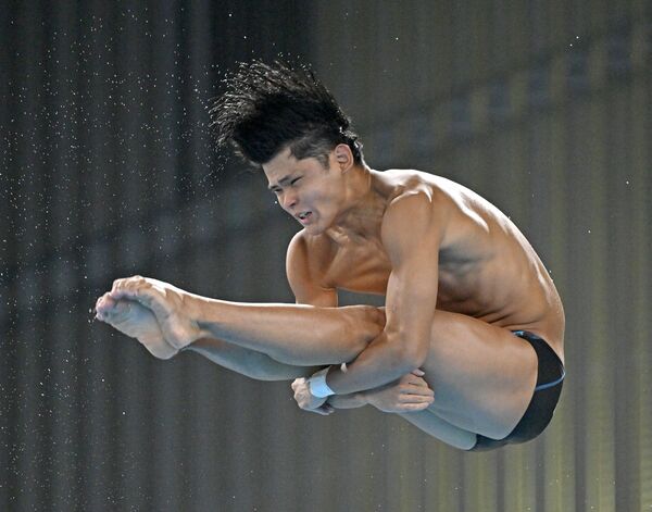 少年男子板飛び込み決勝 5位に入った古谷(宇南高)の5回目の演技=磯真奈美撮影