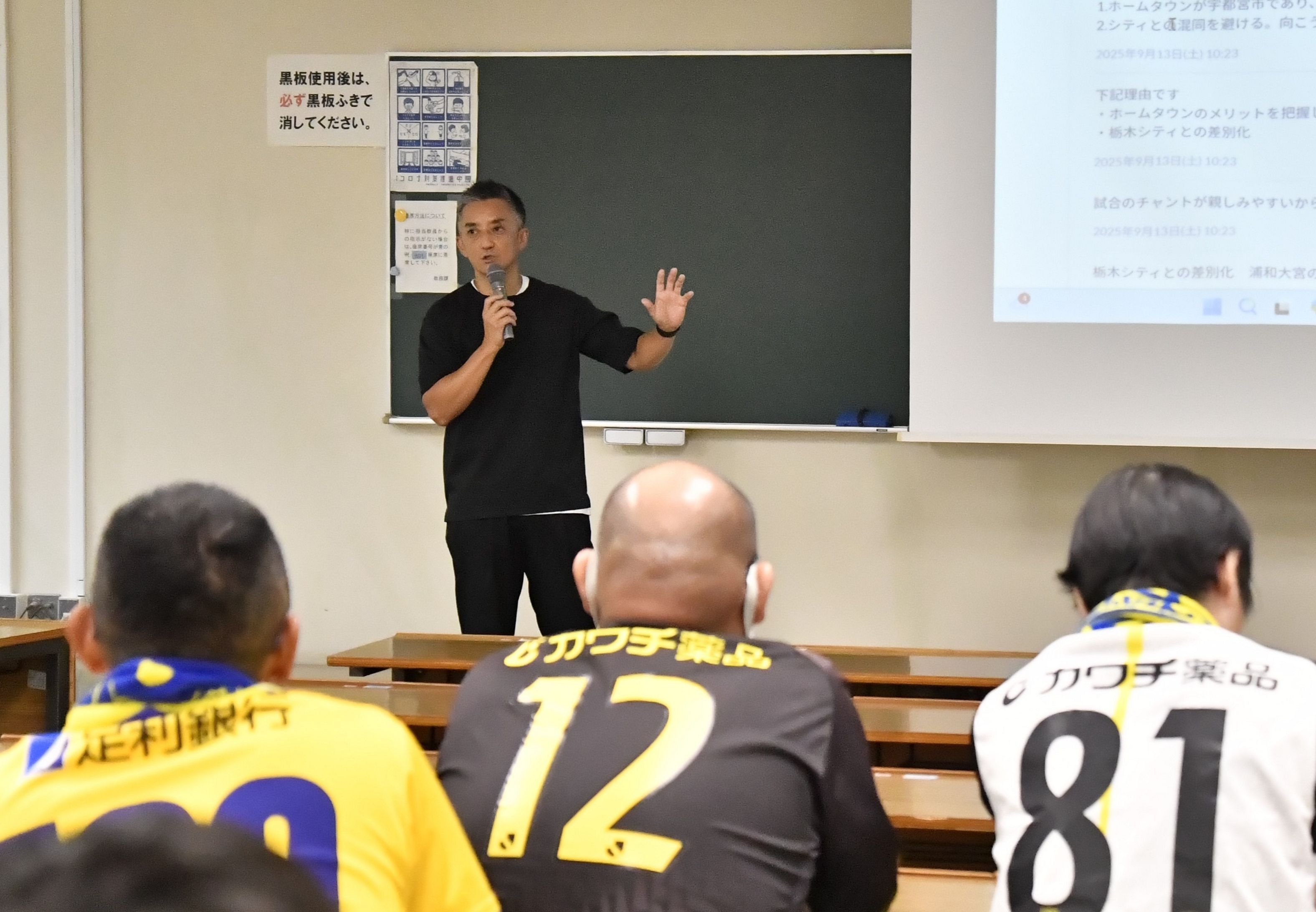 クラブ名変更の検討などについて説明する橋本社長=作新大