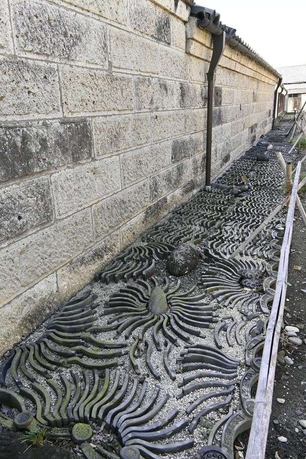 店の裏側にある瓦アート。巴波川など栃木の街をイメージしたデザインはおしゃれだ