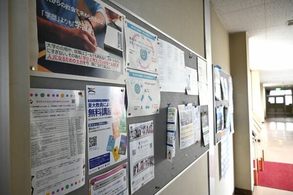 学外のプログラムやコンテストなどの案内が並ぶ校内=矢板東高