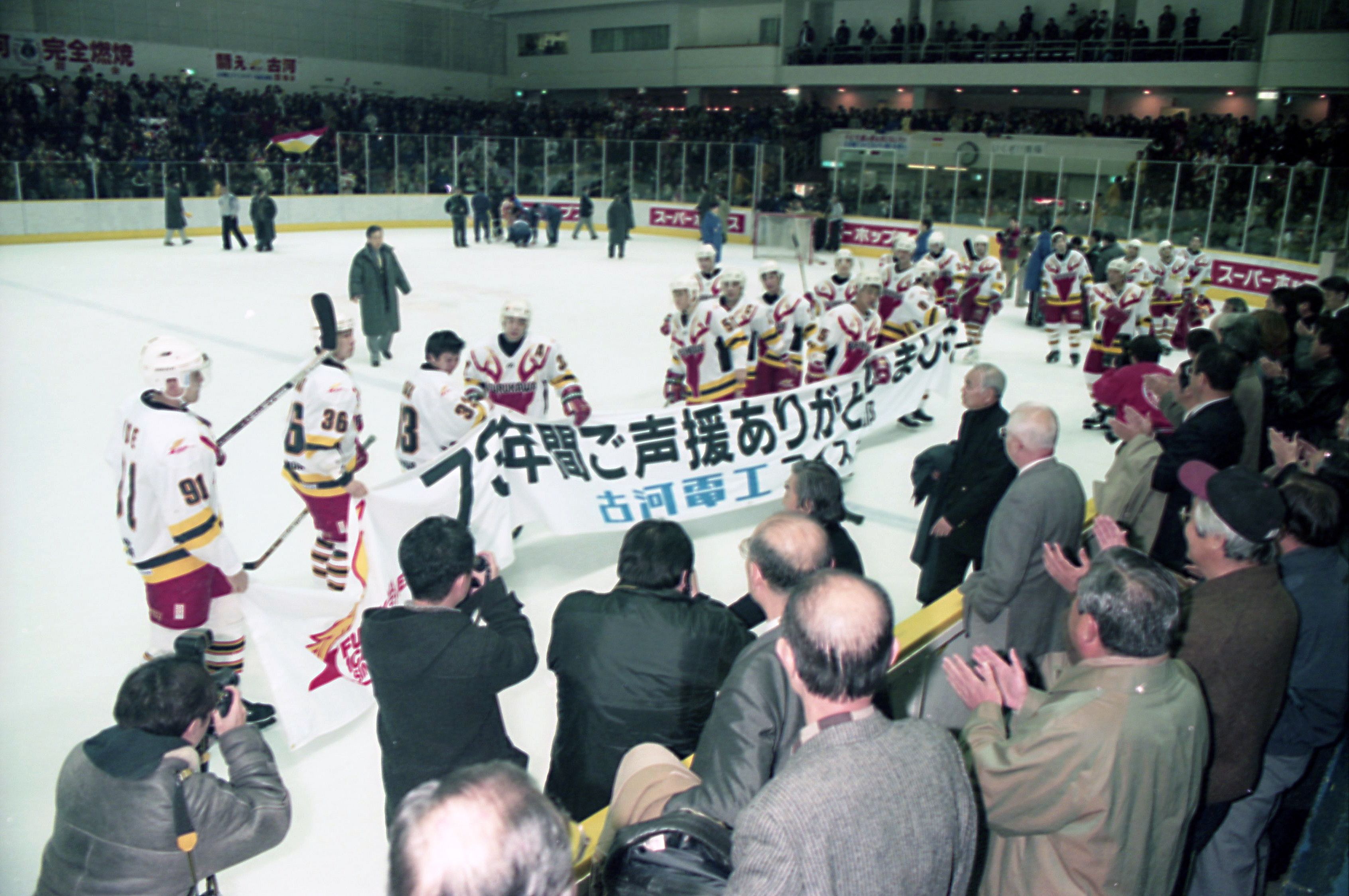 「73年間ご声援ありがとうございました」の横断幕を持ってリンクを1周する古河電工の選手たち=1999年3月8日、東京都東伏見アイスアリーナ
