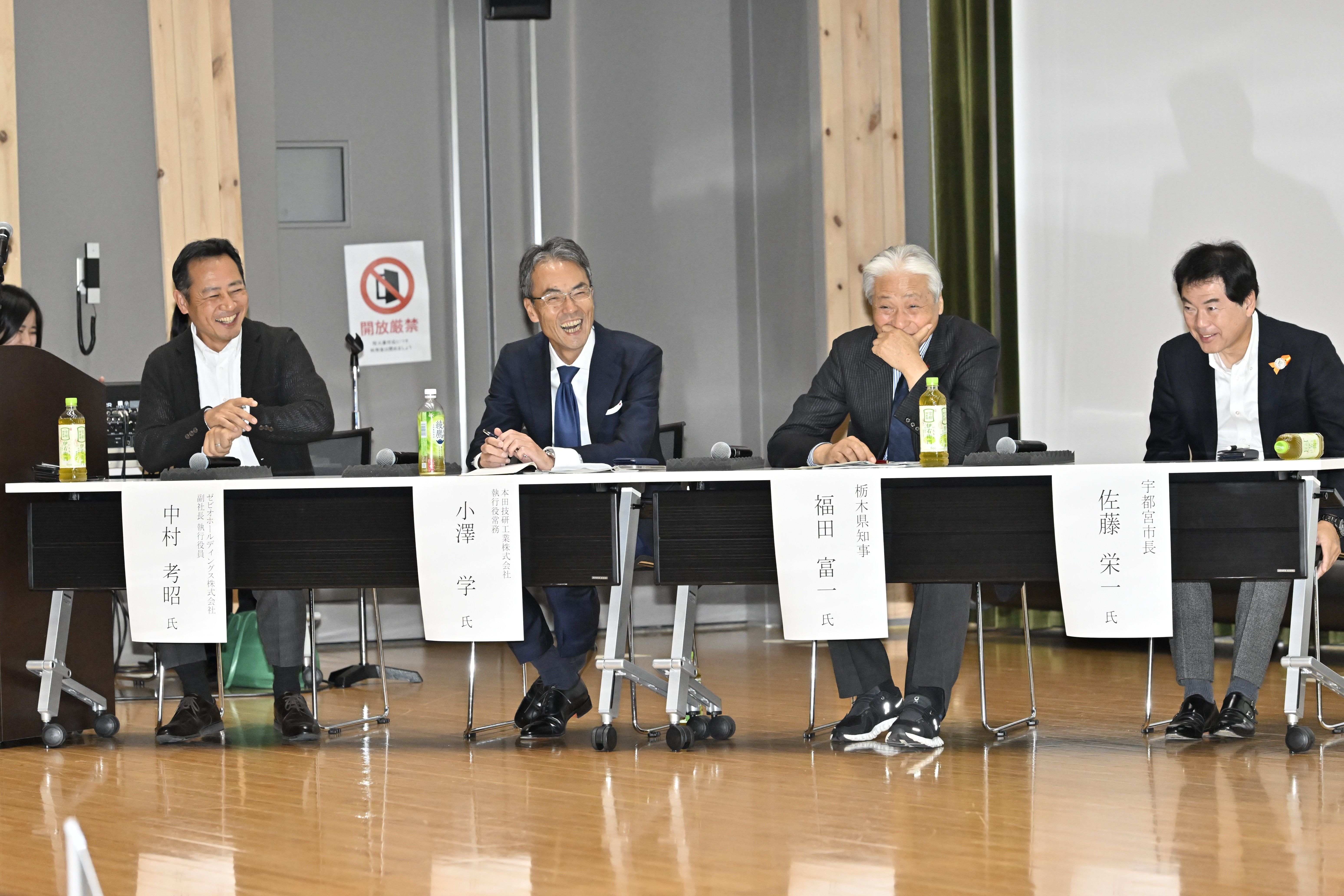 ホンダの小澤常務(左から2人目)、福田知事(同3人目)らが参加し和やかな雰囲気で行われた討論会=7日午後、宇都宮市宮みらい