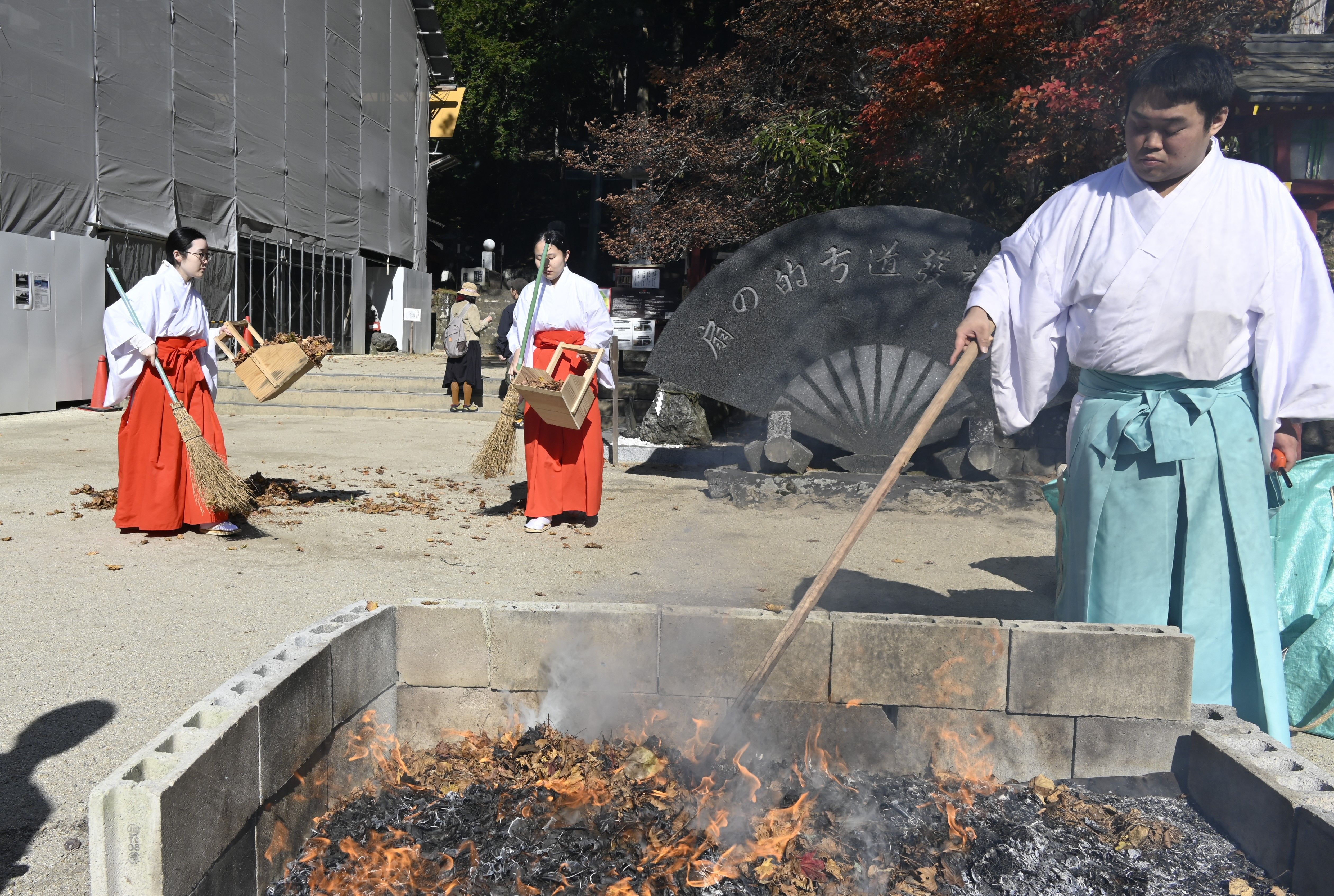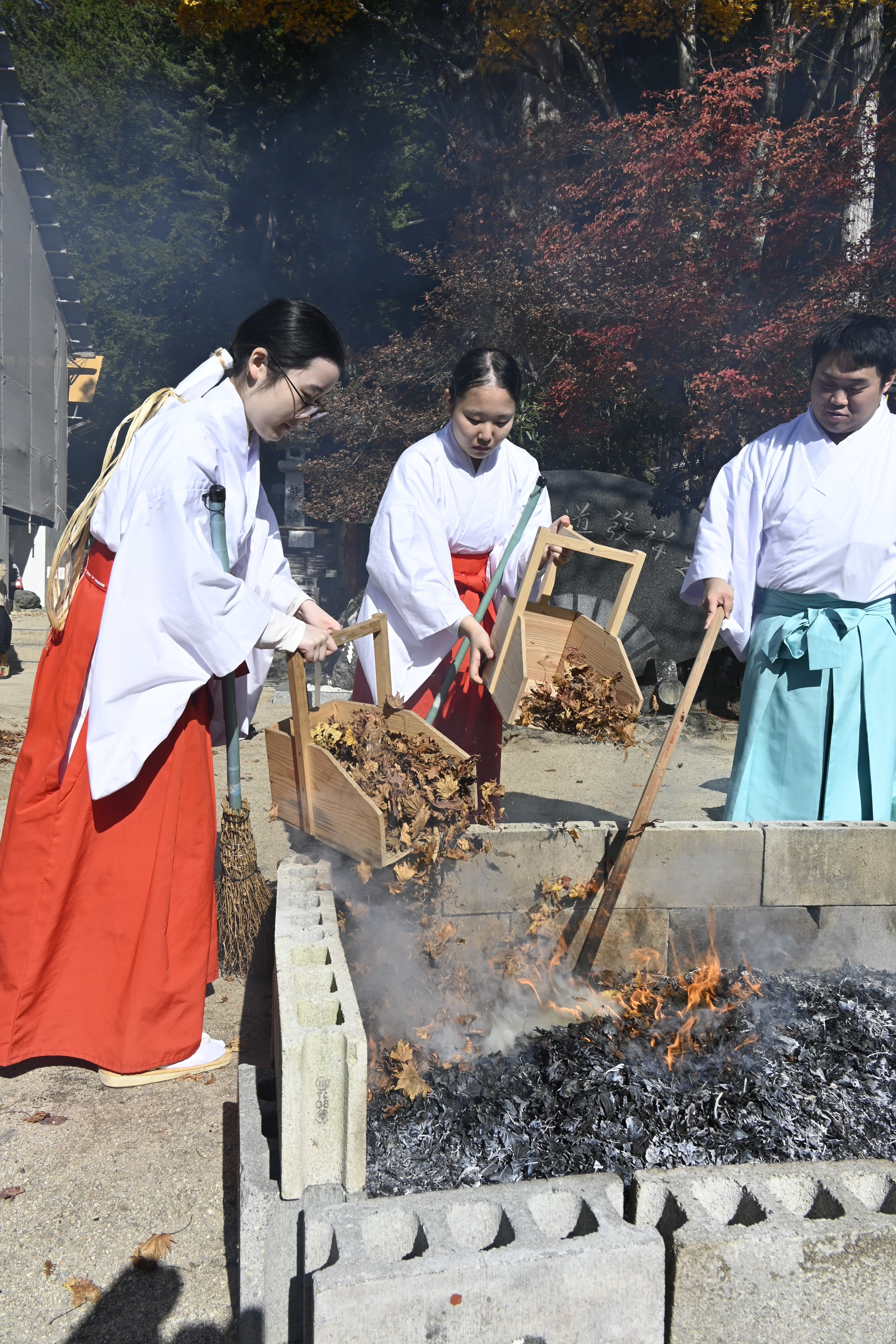 かやぶき屋根の建物の周囲を彩る紅葉=7日午前10時55分、日光市湯西川