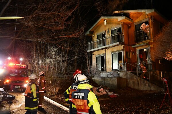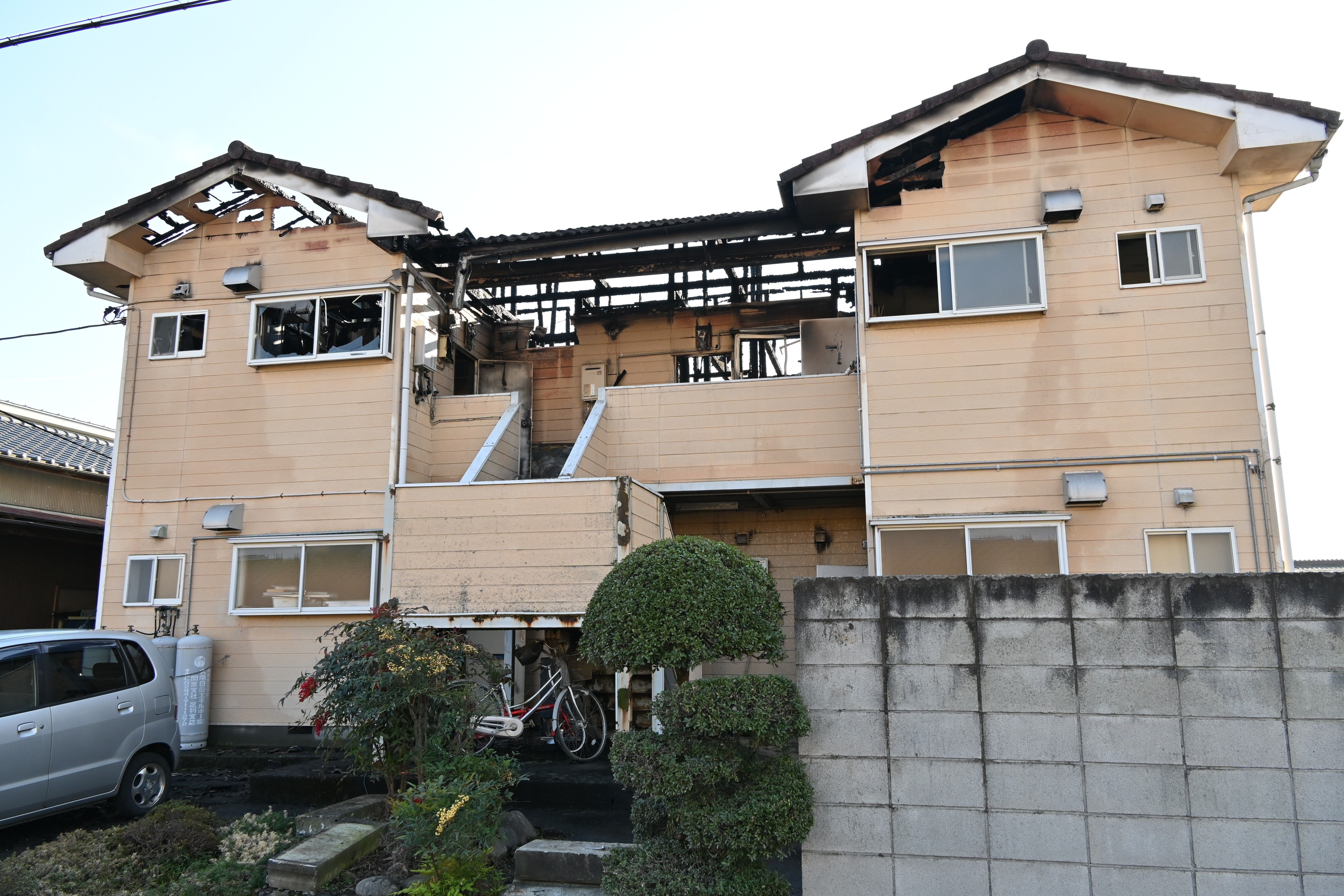 焼け跡から1人の遺体が見つかったアパート=30日午後2時30分、足利市福富町