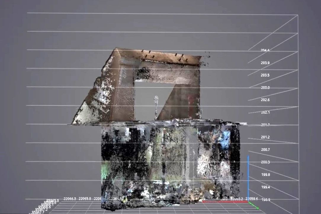 鎮碇の3次元測量図。中央に見える鉤と支脚部上部のボルトが直線上にあることが分かる