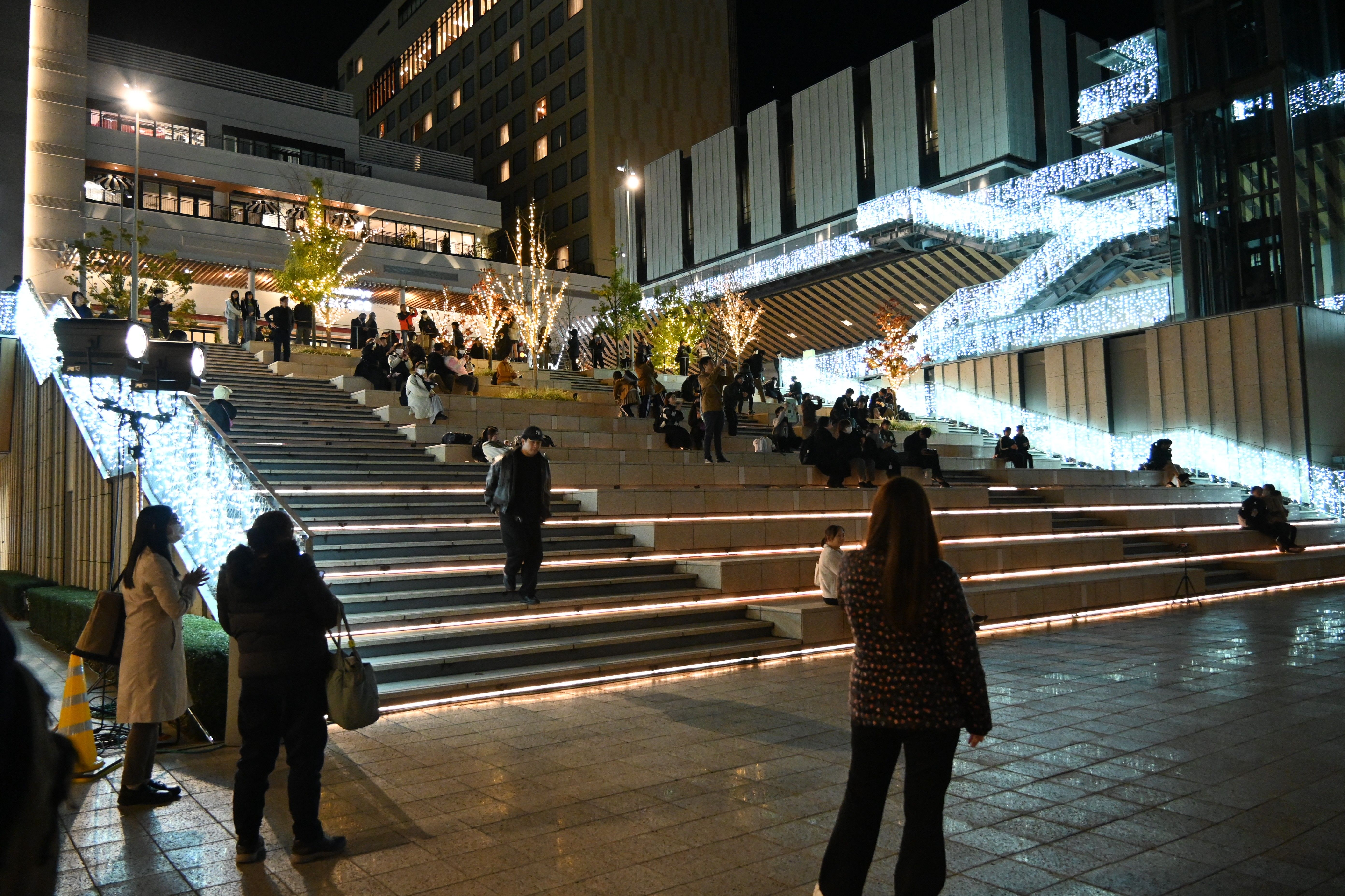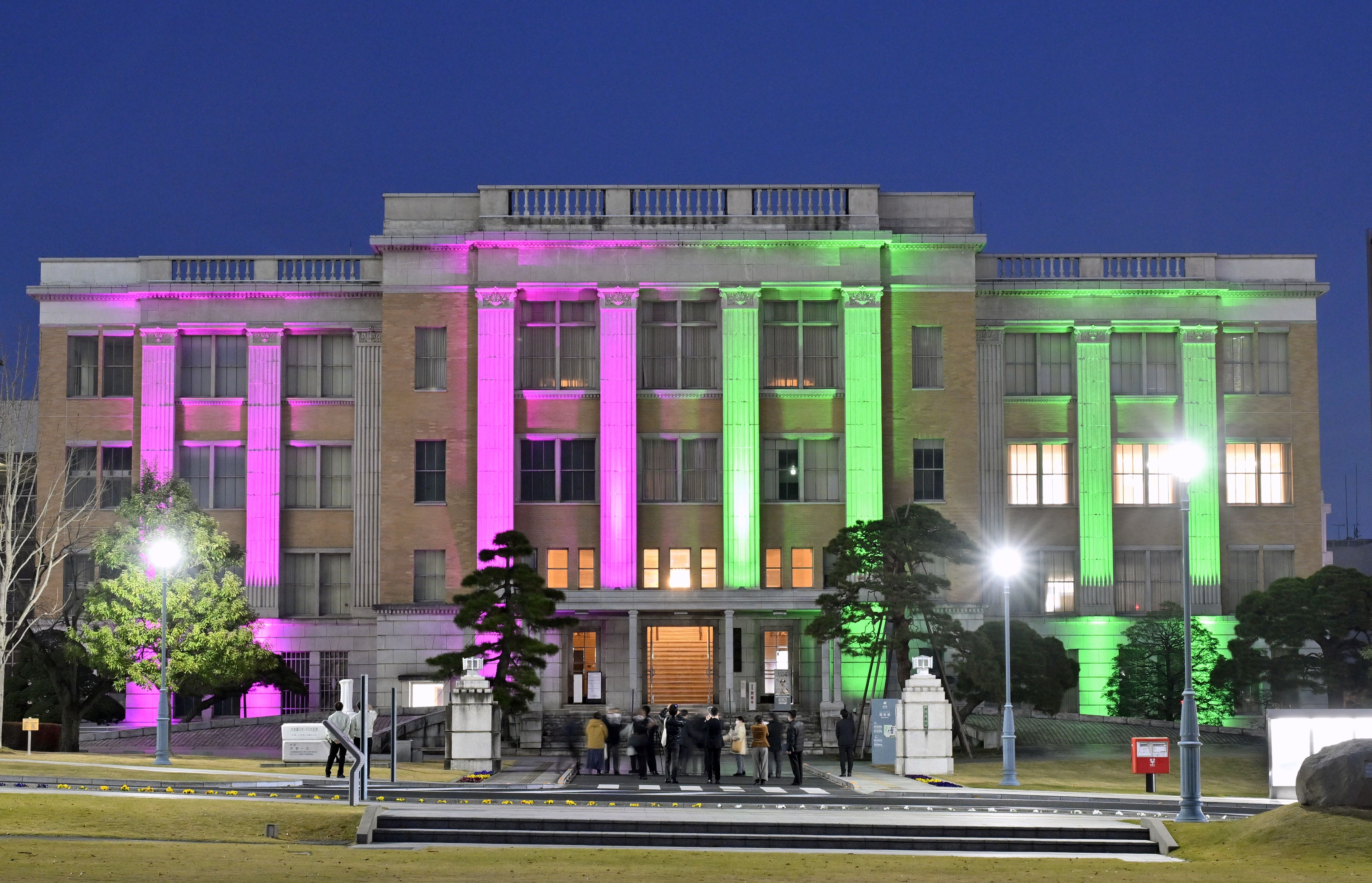 ピンクと緑でライトアップされた県庁昭和館=1日午後5時、宇都宮市塙田1丁目