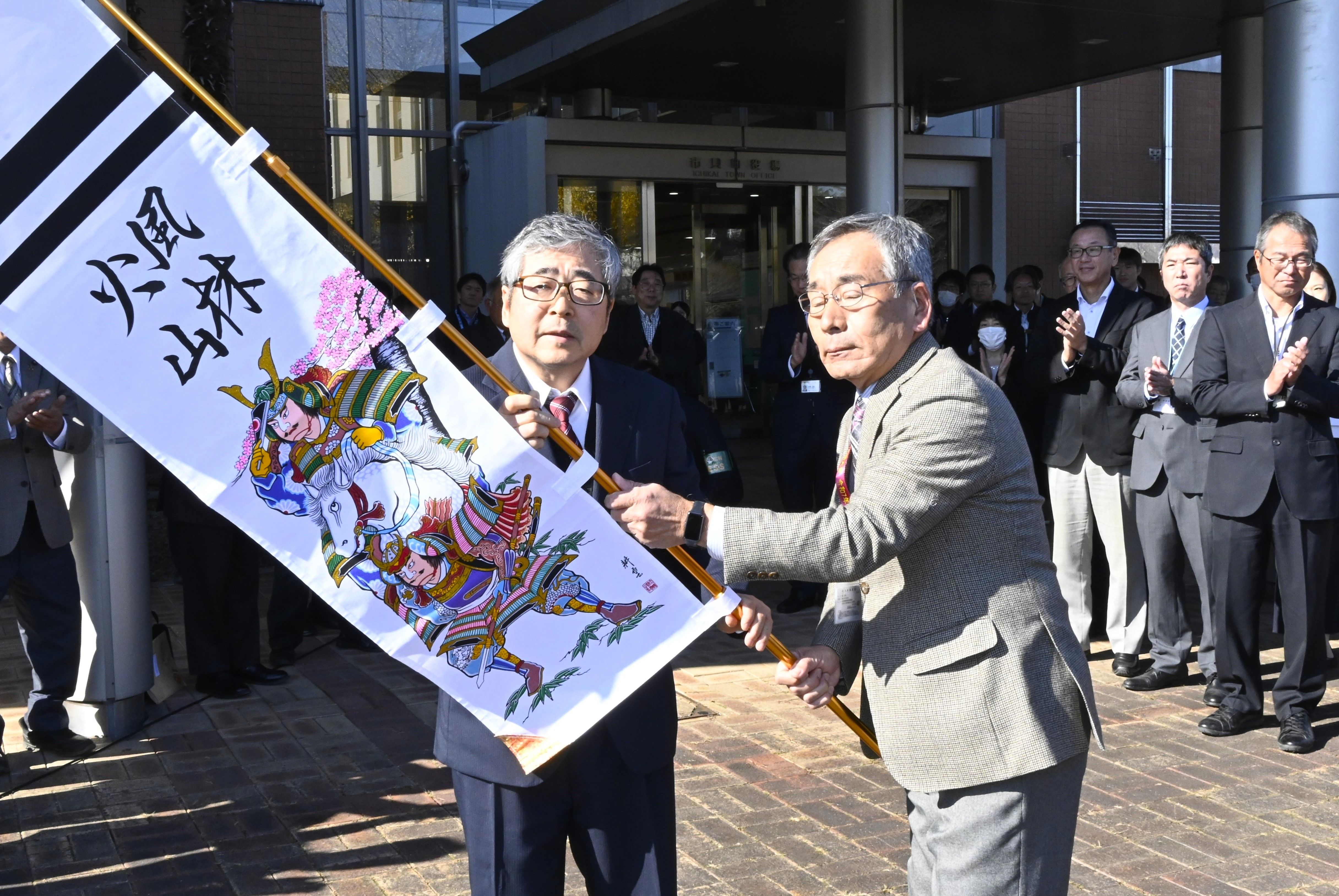 山内副町長(右)から記念品となる武者絵ののぼり旗を受け取る入野町長