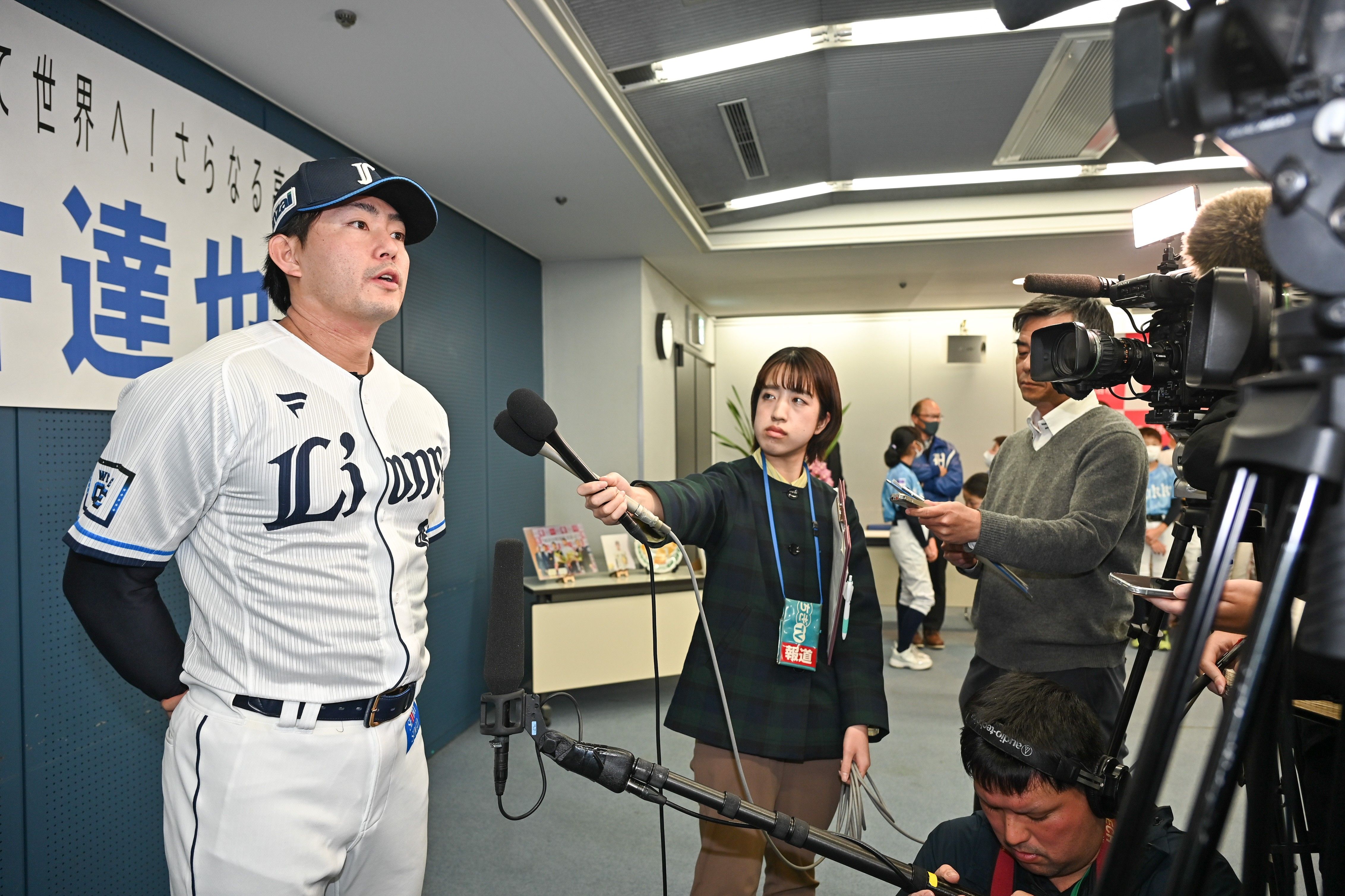 委嘱状交付式終了後、取材に応じる今井投手(左)=26日午後、鹿沼市坂田山2丁目