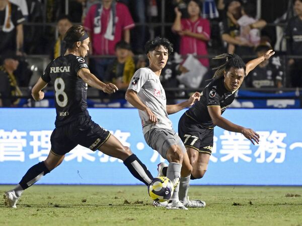 相手からボールを奪う田中(右)と森=9月27日の鳥取戦