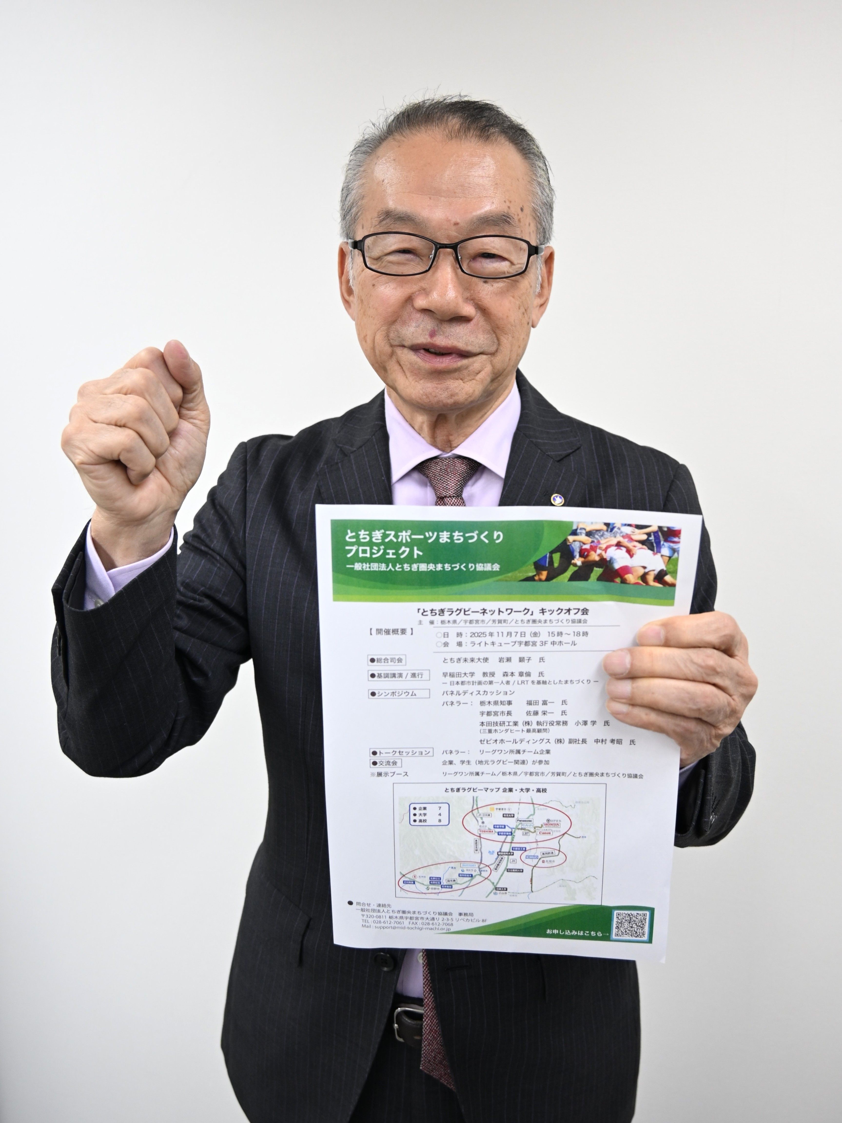 キックオフ会のチラシを掲げ、意気込む新見常務理事