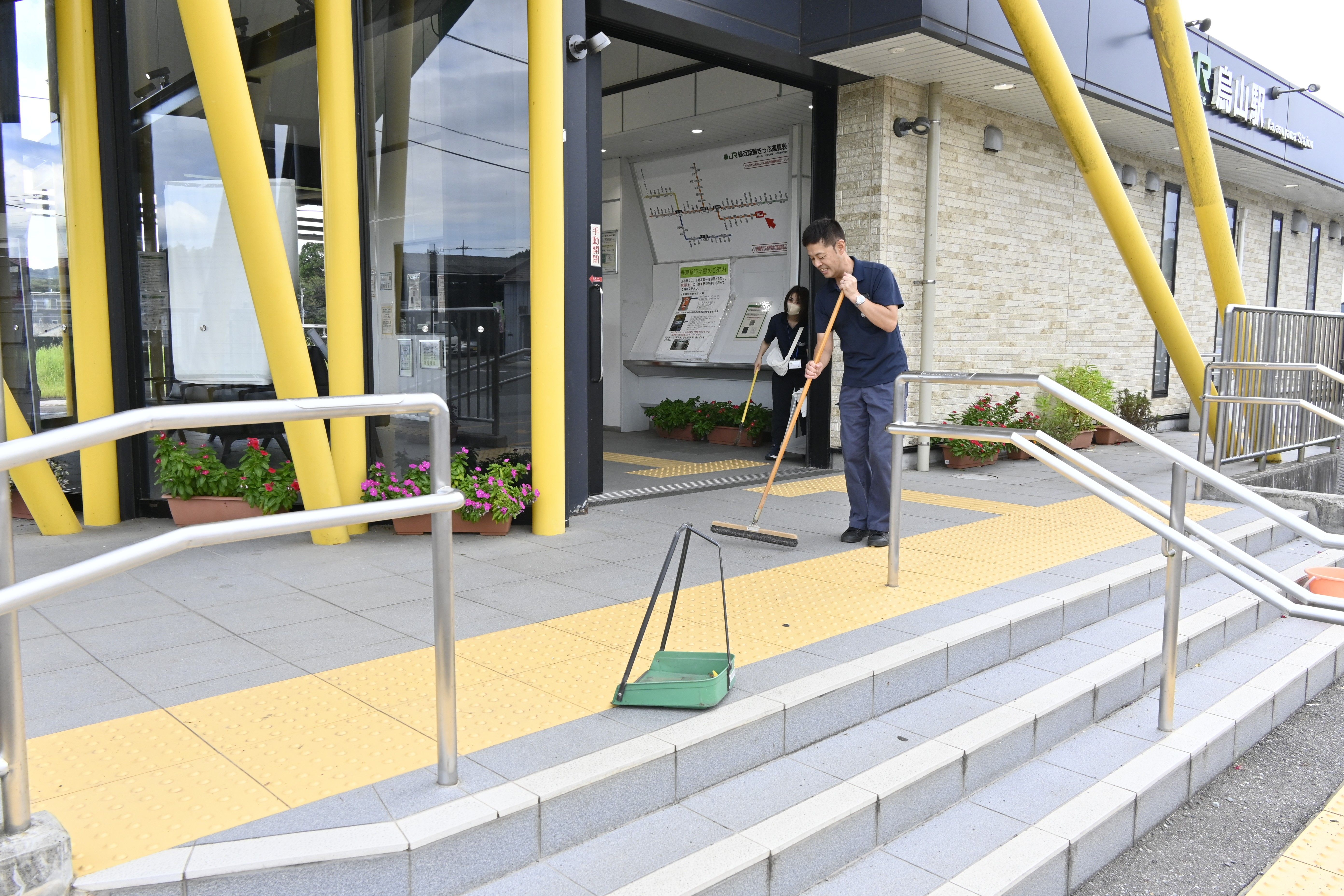 第一声を放つ小塙斉氏=4日午前10時20分、市貝町市塙、磯真奈美撮影