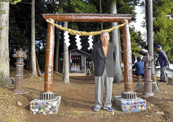 益子焼の鳥居と奉納した佐藤さん