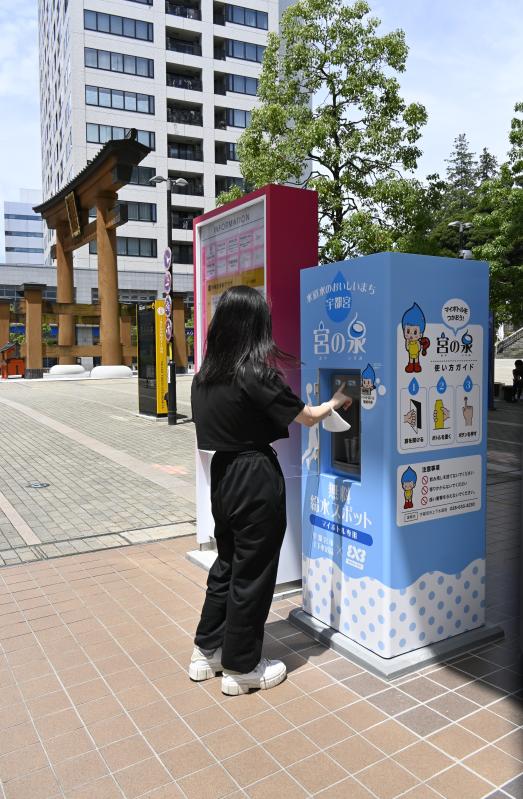 うつのみや表参道スクエアの正面入り口に設置された「宮の泉」。正面の扉を開け、マイボトルを置き、ボタンを押して給水する