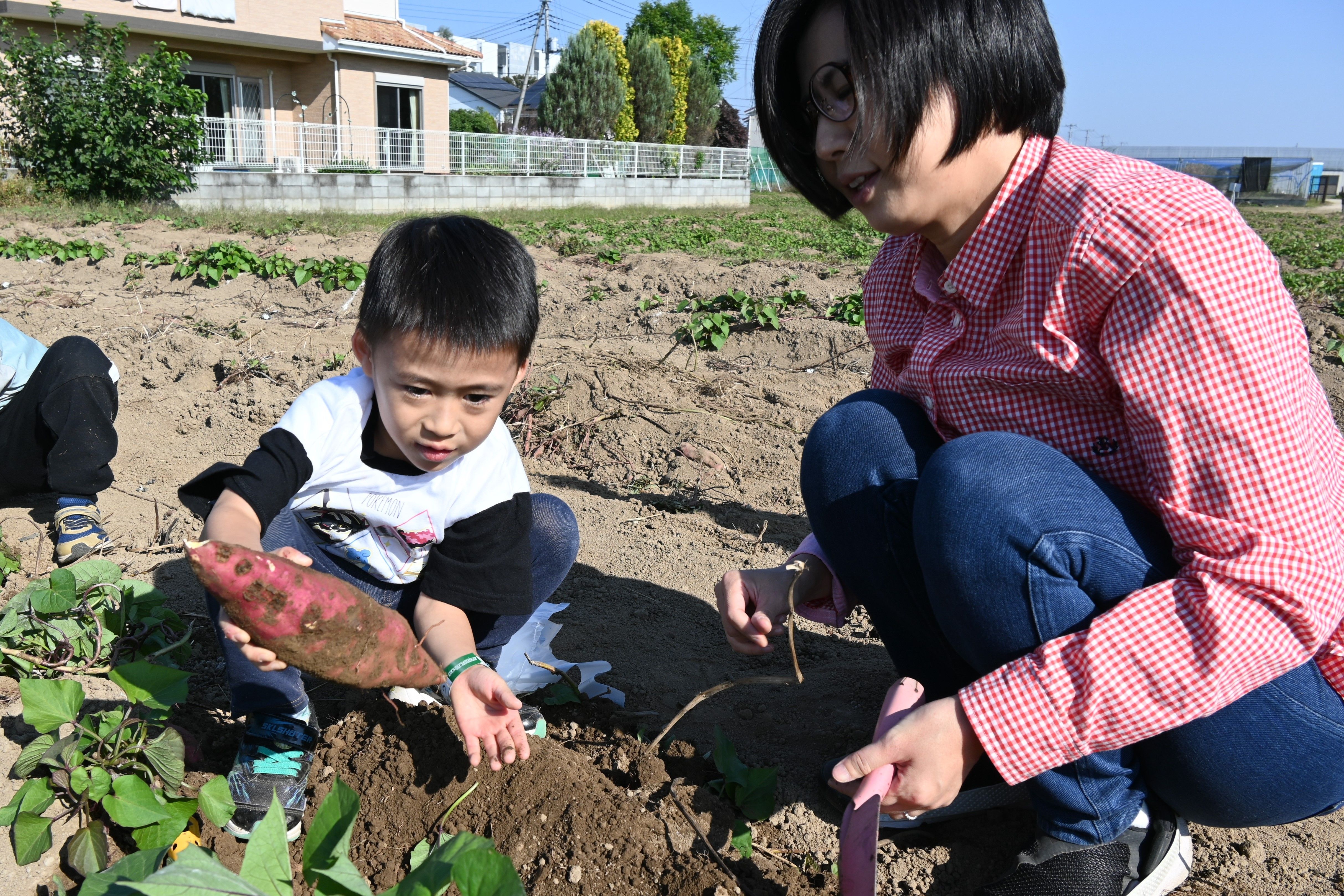 旬のサツマイモ掘りを楽しむ親子