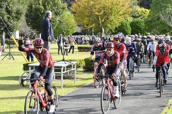 ゲストライダーを先頭にスタートする70キロコースの参加者ら