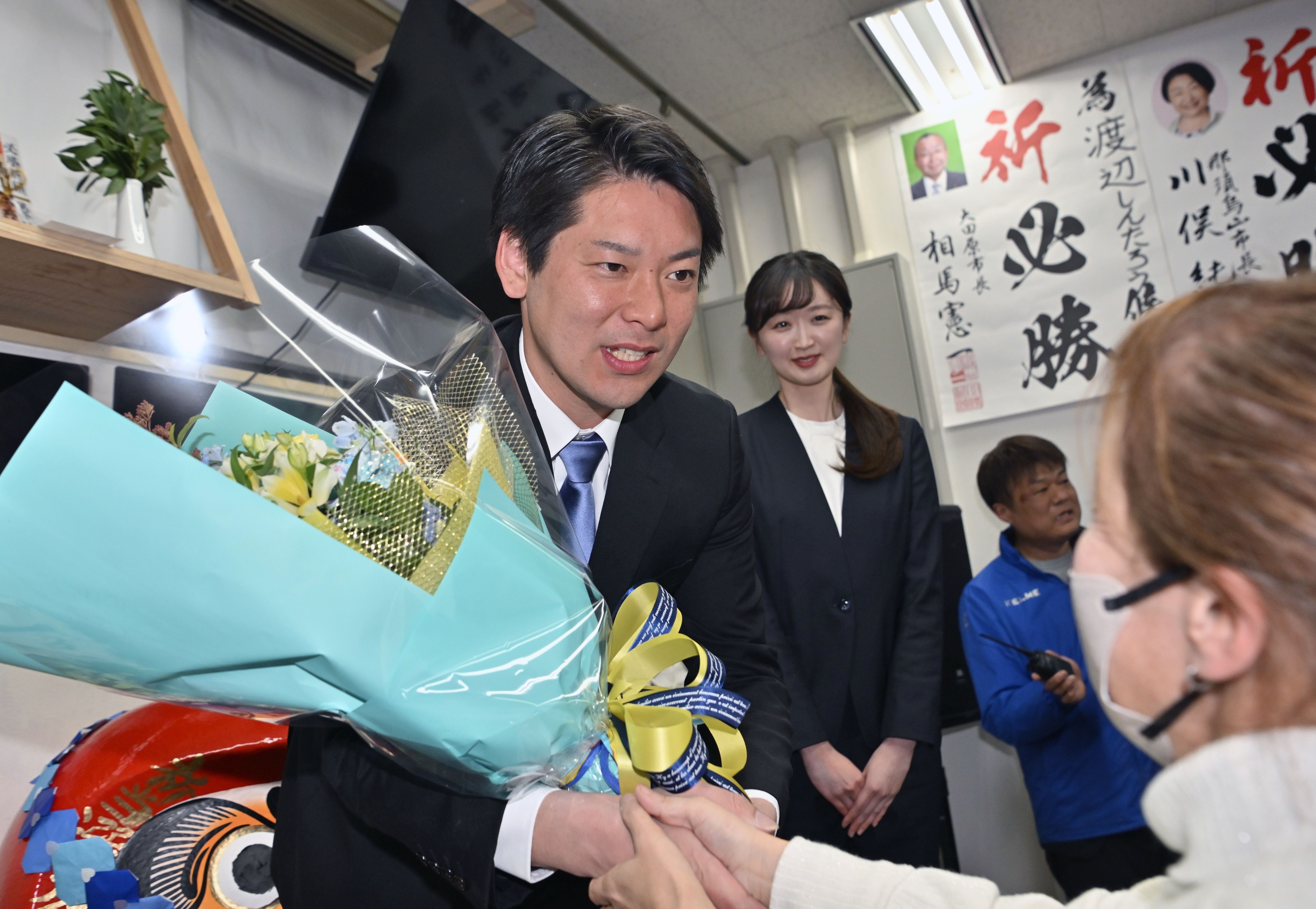 初当選を果たし、花束を受け取る渡辺真太朗氏(左)=8日午後10時55分、大田原市美原1丁目